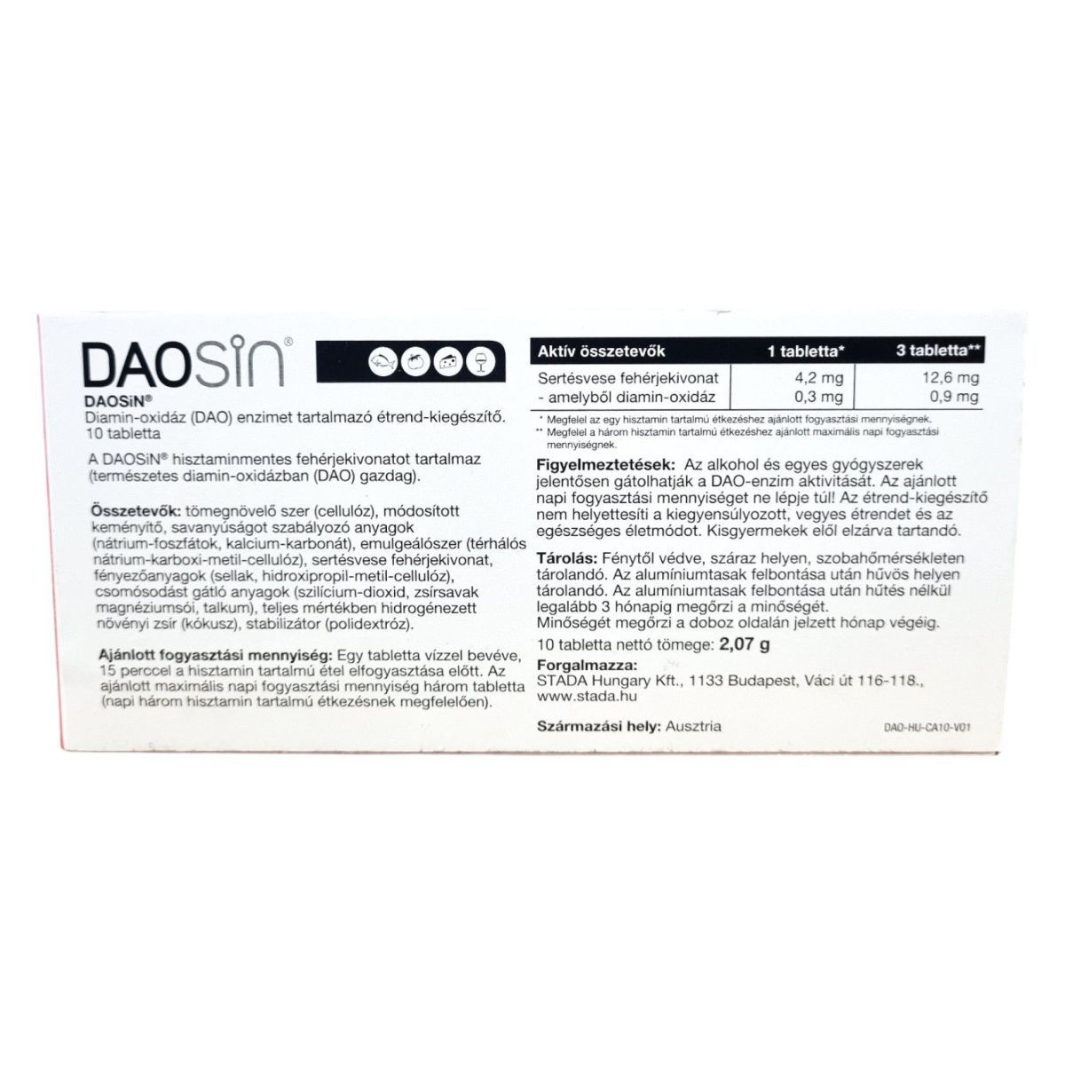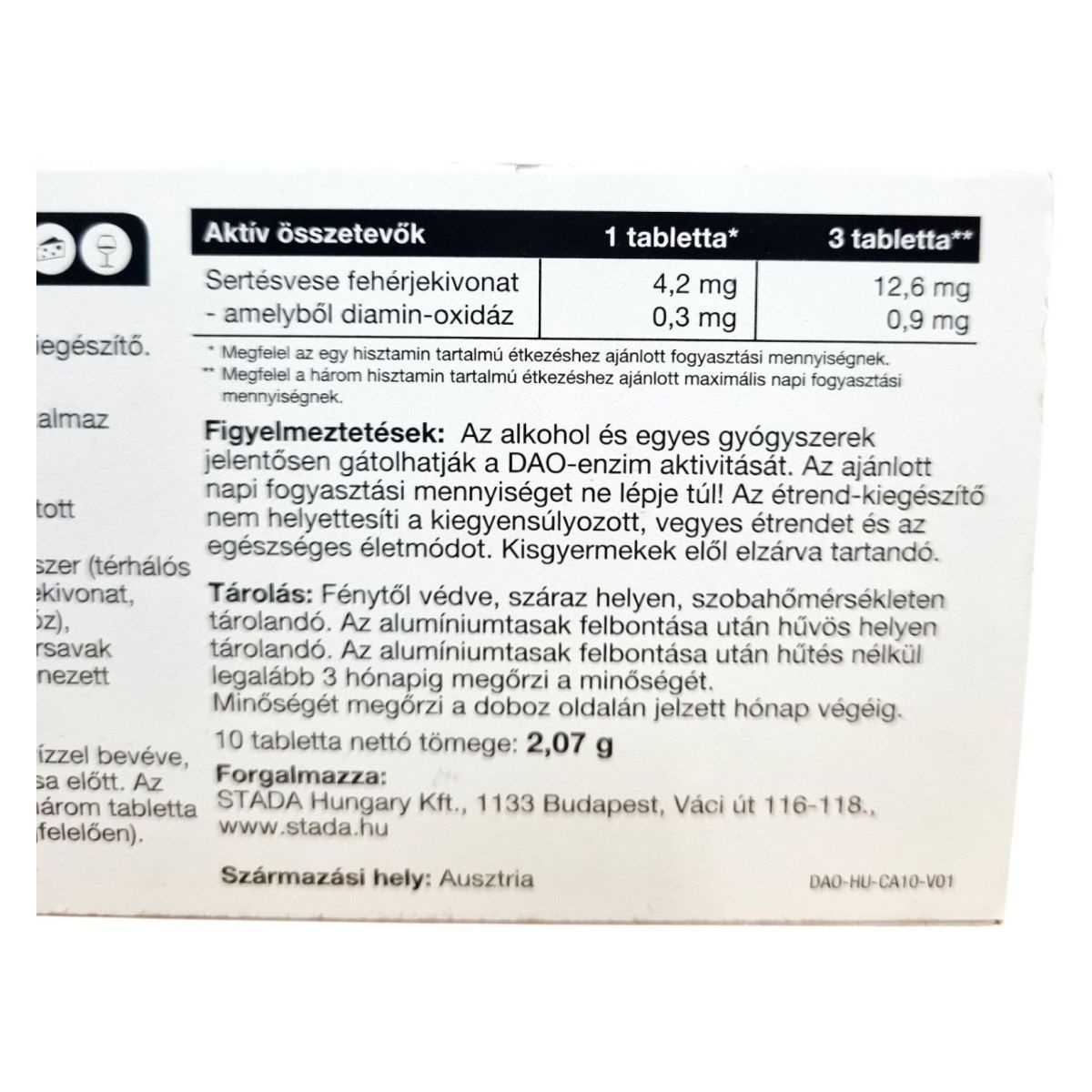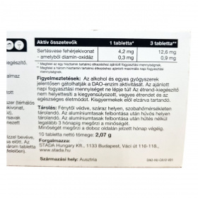 Az alkohol és egyes gyógyszerek gátolhatják a DAO-enzim aktivitását. Az étrend-kiegészítő nem helyettesíti a kiegyensúlyozott, vegyes étrendet és az egészséges életmódot. Kisgyermekektől elzárva tartandó. Az ajánlott napi mennyiséget ne lépje túl.