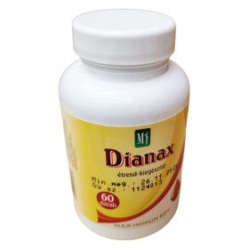 A Dianax étrend-kiegészítő a Max-Immun Kft. terméke, amely gyapjas tintagomba kivonatot tartalmaz. A termék poliszacharid tartalma miatt hozzájárulhat az immunrendszer támogatásához. A kapszulák adagolása rugalmasan igazítható az egyéni szükségletekhez, napi 1-3 kapszula fogyasztása javasolt. A termék összetevői között megtalálható a zselatin, valamint csomósodásgátló anyagok, mint a magnesium stearat és a kolloid szilícium dioxid. Fontos, hogy az étrend-kiegészítő nem helyettesíti a vegyes étrendet és az egészséges életmódot, és kisgyermekek elől elzárva tartandó. A terméket száraz, hűvös helyen, nedvességtől óvva kell tárolni.