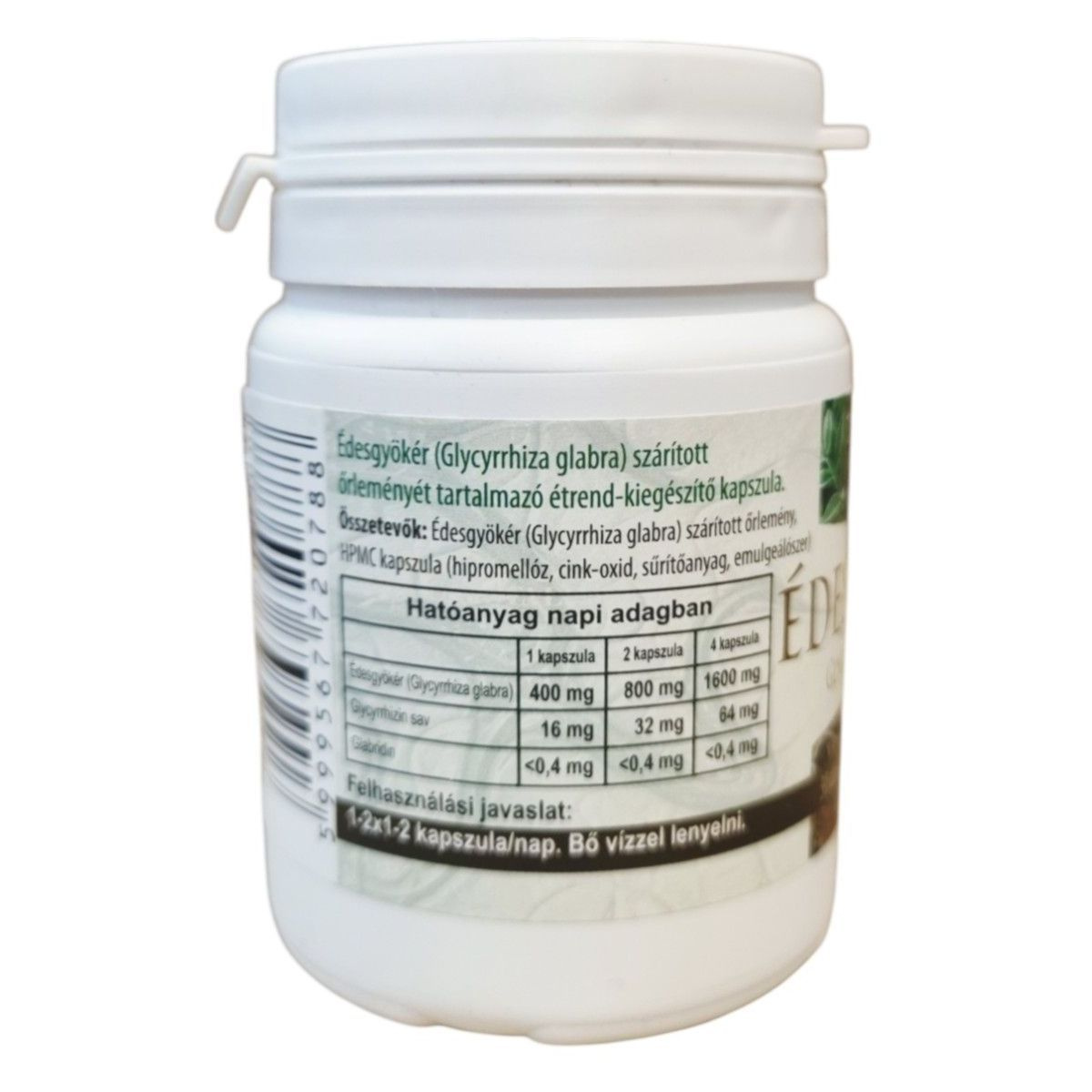 Az Édesgyökér kapszula Glycyrrhiza glabra szárított őrleményét tartalmazza, amely hozzájárulhat az egészséges életmód támogatásához. A termék cink-oxidot is tartalmazhat, amely fontos nyomelem lehet.