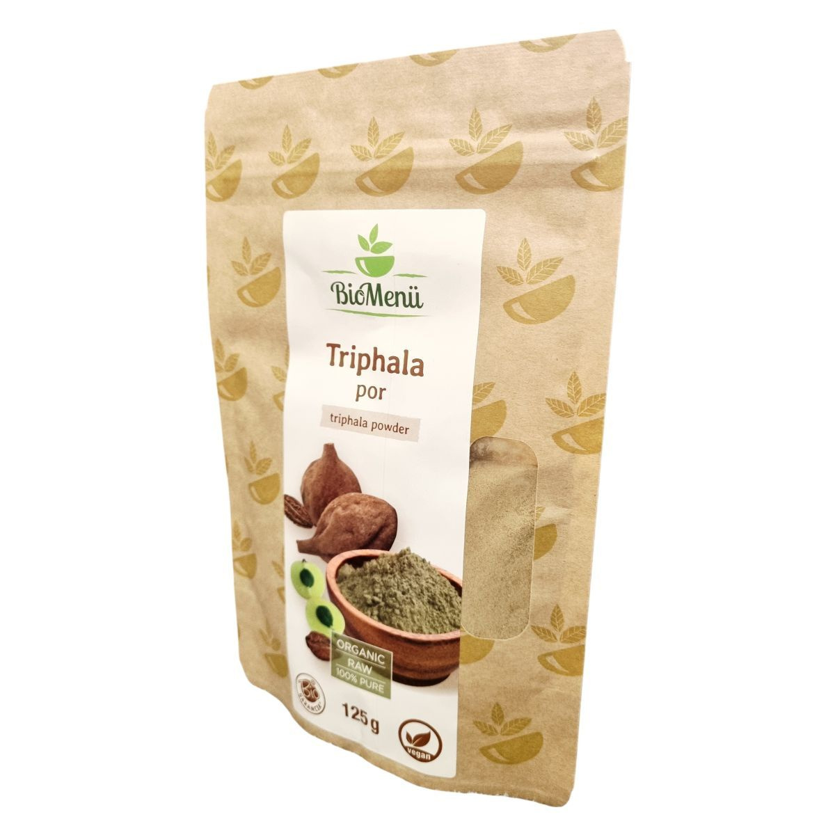 A BioMenü Triphala por egy 100%-ban bio, organikus eredetű, természetes alapanyagokból készült termék, mely amla, bibhitaki és haritaki gyümölcsök őrleményét tartalmazza. A por Indiából származik, és a csomagolás 125 gramm tiszta triphala port tartalmaz, ami 25-62 adagra elegendő. A termék nyomokban glutént és egyéb allergéneket tartalmazhat, ezért allergiásoknak javasolt körültekintően használni. Vegánok és különböző étkezési irányzatok követői számára is alkalmas. A termék fogyasztása javasolt meleg vízbe és mézbe keverve az adagolási útmutató szerint, ami napi egyszeri elkészítést jelent. A készítmény tárolása száraz, hűvös helyen, megfelelően zártan ajánlott, hogy megőrizze frissességét és tulajdonságait.