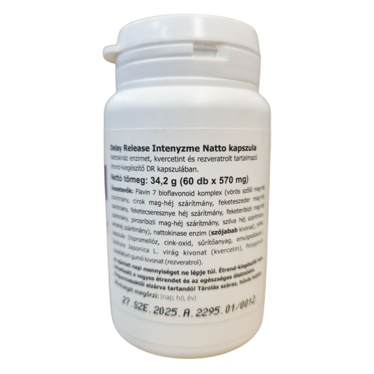A Delay Release Intenzyme Natto kapszula egy speciális étrend-kiegészítő, amely nattokináz enzimet, kvercetint és rezveratrolt tartalmaz. A termék célja, hogy támogassa a szervezet egészséges működését a DR kapszula technológia segítségével, amely elősegítheti a hatóanyagok optimális felszívódását. A termék összetevői között megtalálható a Flavin 7 bioflavonoid komplex, amely különböző gyümölcsök és növények szárítmányait tartalmazza. A termék használata előtt terhes kismamáknak és véralvadásgátlót szedőknek javasolt orvosukkal konzultálni.