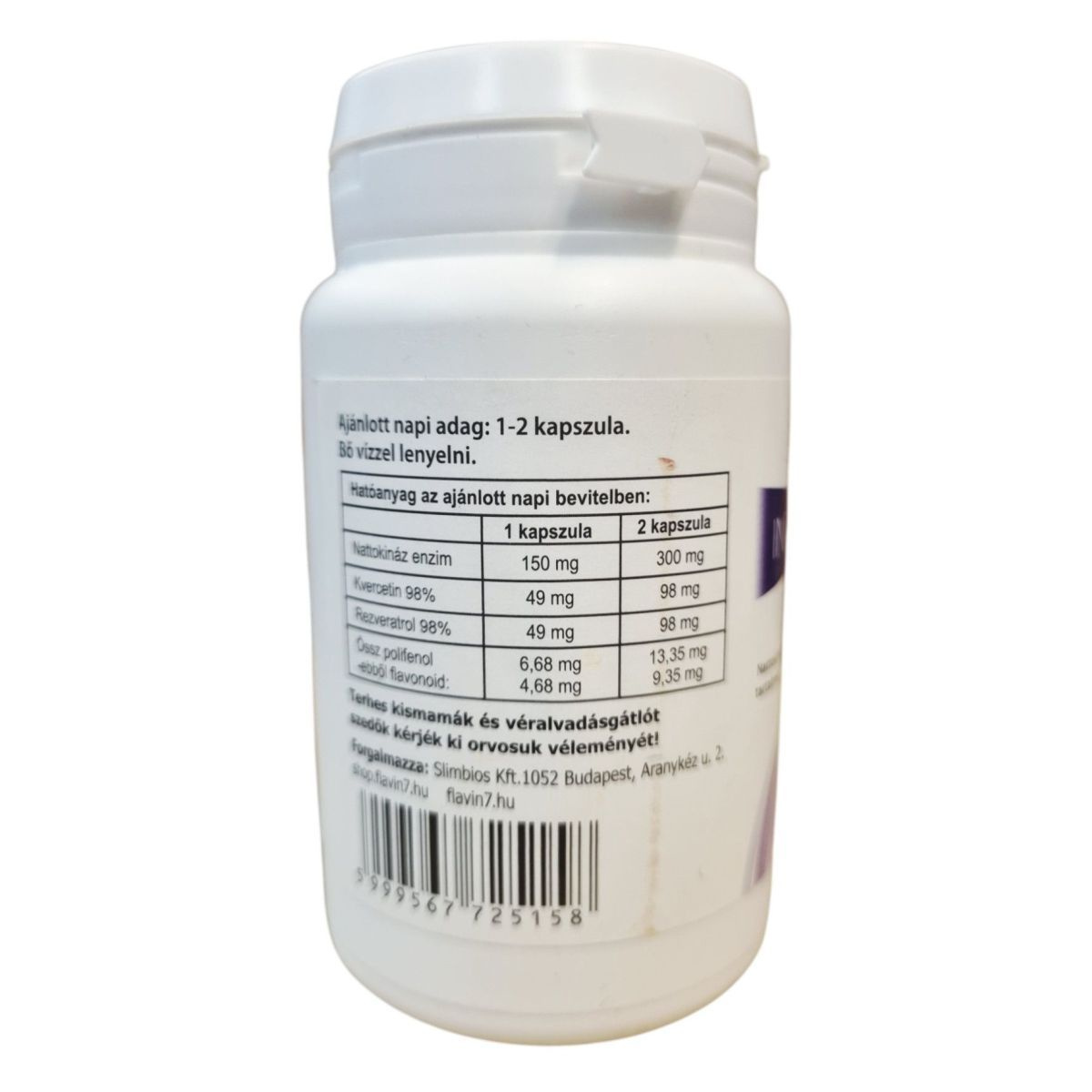Flavin 7 bioflavonoid komplex (vörös szőlő mag-héj szárítmány, cirok mag-héj szárítmány, feketeszeder mag-héj szárítmány, feketecseresznye héj szárítmány, feketeribizli mag-héj szárítmány, pirosribizli mag-héj szárítmány, szilva héj szárítmány, alma héj szárítmány), nattokinase enzim (szójabab kivonat), kapszula (hipromellóz, cink-oxid, sűrítőanyag, emulgeálószer), Sophora Japonica L. virág kivonat (kvercetin), Polygonum cuspidatum gyökér kivonat (rezveratrol).