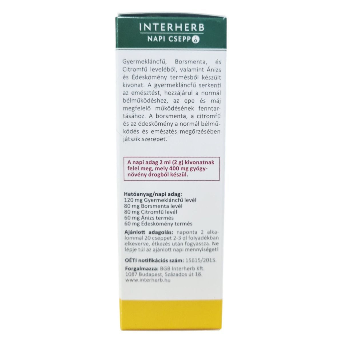 Az INTERHERB NAPI CSEPP Gyomor Cseppek folyékony étrend-kiegészítő, amely a gyermekláncfű, borsmenta, citromfű, ánizs és édeskömény kivonatával támogathatja az emésztést és a normál bélműködést.