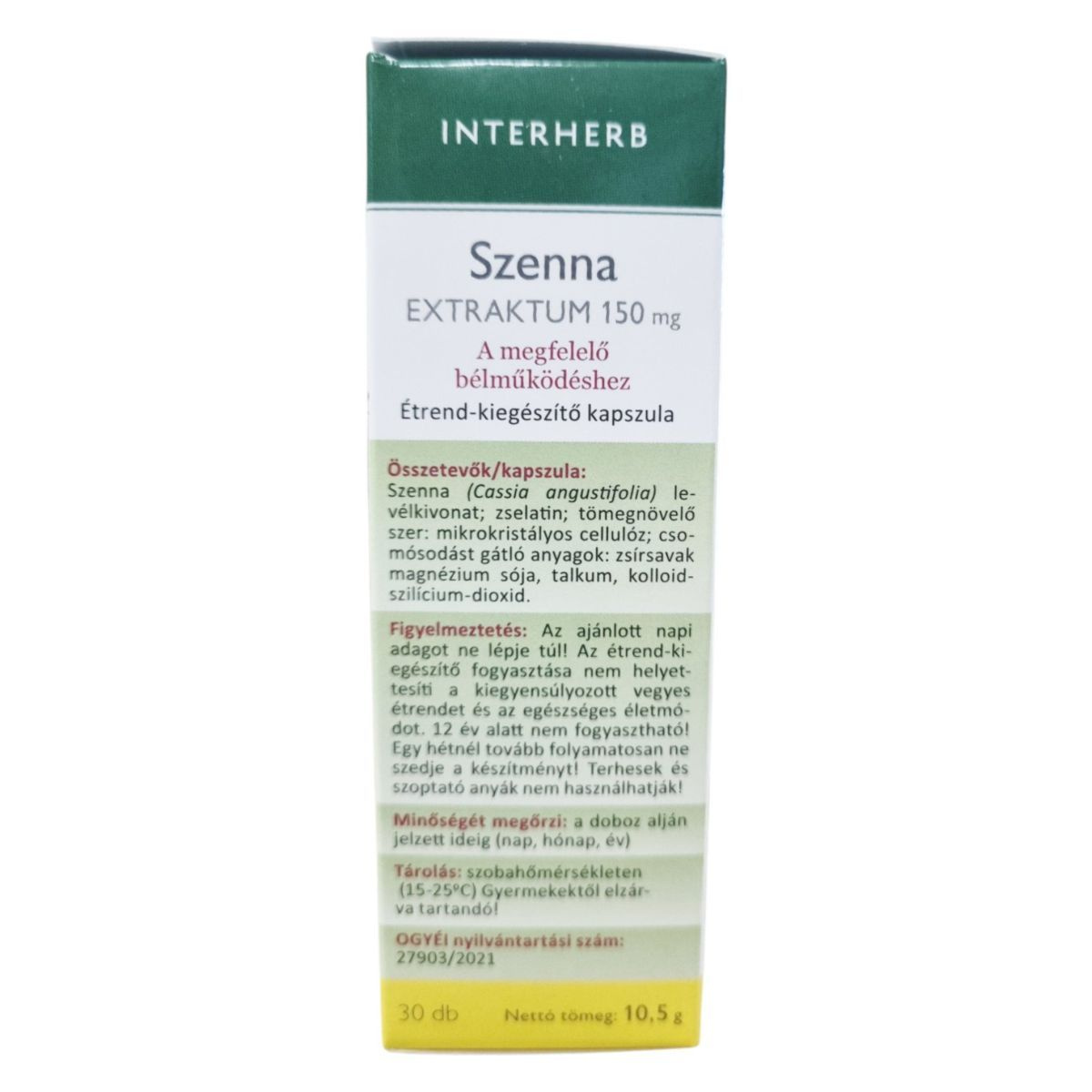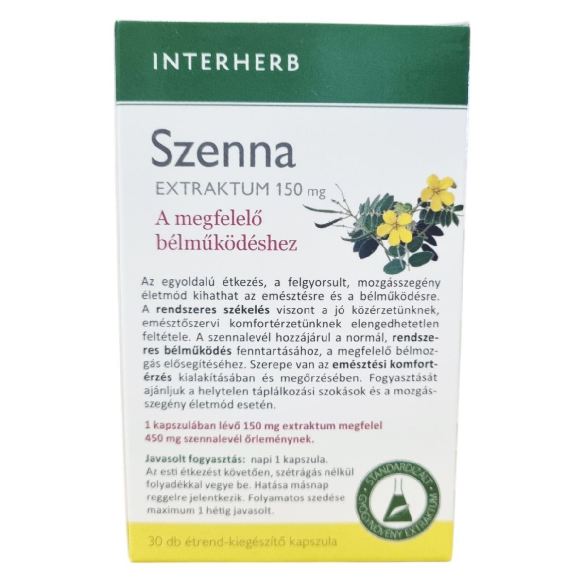 Az INTERHERB Szenna EXTRAKTUM 150 mg kapszula a megfelelő bélműködés támogatására szolgálhat. A termék standardizált szennozid hatóanyag tartalommal rendelkezik, amely hozzájárulhat a normál bélmozgás elősegítéséhez. A szennalevél kivonat szerepe lehet az emésztési komfortérzet kialakításában, különösen az egyoldalú étkezés és a mozgásszegény életmód esetén. A termék koncentrált extraktumot tartalmaz, bevizsgált alapanyagokból készül, és hazai fejlesztés eredménye. A gyártási szám a dobozon van feltüntetve, és a minőségét a doboz alján jelzett ideig őrzi meg.