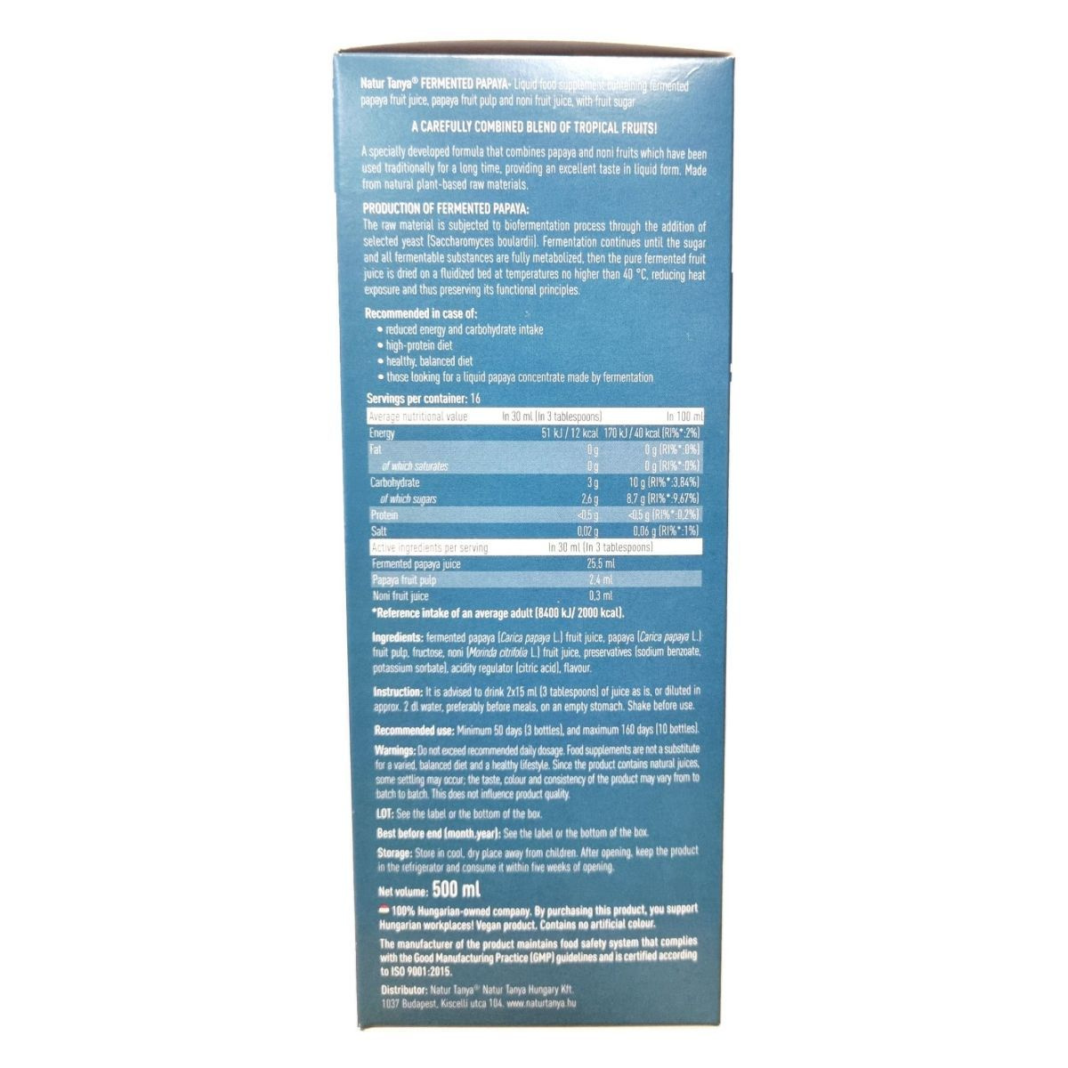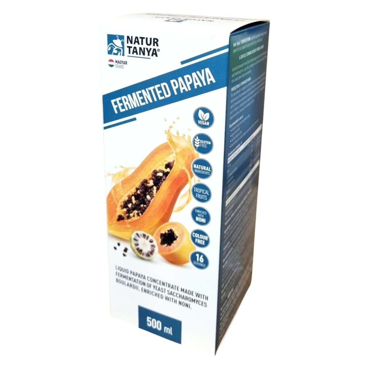 A Natur Tanya® Fermentált Papaya speciális eljárással, biofermentációval készült papaya gyümölcslé, amelyhez Saccharomyces boulardii élesztőt adnak. A fermentáció alatt a cukor és erjeszthető anyagok lebomlanak, majd a folyadékot 40 °C alatti levegővel szárítják, megőrizve annak funkcionális hatóanyagait. Az ital természetes forrásból származó trópusi gyümölcsökből készül, különleges ízélményt nyújt. Alacsony energia- és szénhidrátbevitel mellett is fogyasztható, magas fehérjetartalmú étrendbe illeszthető, vagy egyszerűen az egészséges, természetes étrendet keresők számára ajánlott.