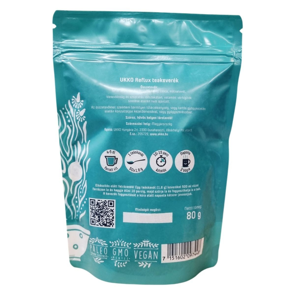 A UKKO Reflux teakeverék egy gondosan összeállított gyógynövény keverék, melynek egy adagja egy teáskanál (1,6 g). Elkészítéséhez 4-5 dl forralt víz szükséges, az áztatási idő 10-15 perc. Használat előtt a keveréket fel kell rázni, majd a forrázott teát leszűrve fogyasztható. A termék Magyarországon készül, nettó tömege 80 g, és paleo illetve vegán étrendbe is illeszthető. A termék minőségét megőrzi a csomagoláson feltüntetett ideig. A termék jelölései között szerepelnek a paleo, GMO-mentesség és vegán tanúsítványok is.