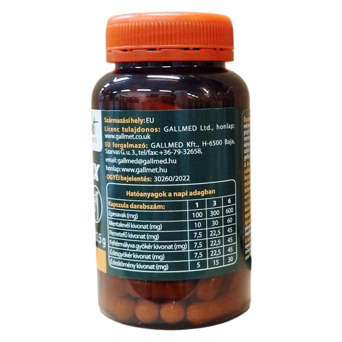 A GALLMET MIX természetes epesavakból és többféle gyógynövény kivonatából álló, bélben oldódó étrend-kiegészítő kapszula, mely az emésztés és az epeműködés támogatására készül. Hatóanyagai között szerepel a liofilizált marhaepe és kivonatok, mint a mentalevél, pemetefű, fehérmályva gyökér, édesgyökér és édeskömény, amelyek hozzájárulhatnak a gyomor- és bélrendszer egészséges működéséhez, az emésztőrendszer támogatásához és az epeműködés normalizálásához. A termék egy nemzetközi laboratóriumi vizsgálaton esett át, amely többek között igazolta a mikrobiológiai tisztaságot, a szennyezőanyagok hiányát, a nehézfémmentességet, valamint a doppingmentességet is. A készítmény használata során figyelembe kell venni az előírt adagolást és az esetleges ellenjavallatokat, mint a heveny eperoham vagy terhesség, továbbá ajánlott a használat megkezdése előtt szakemberrel történő konzultáció.