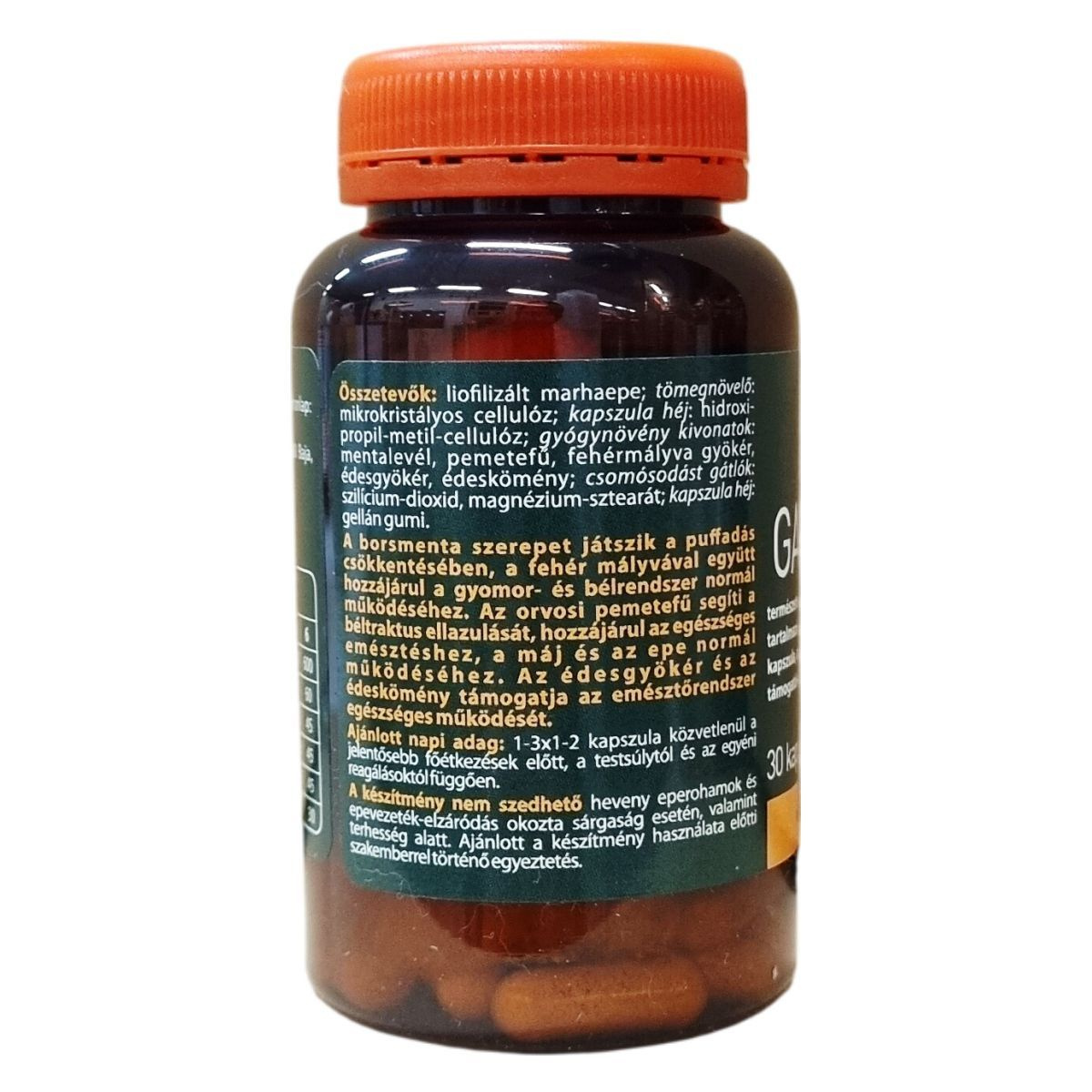 liofilizált marhaepe, mikrokristályos cellulóz, hidroxi-propil-metil-cellulóz kapszula héj, mentalevél kivonat, pemetefű kivonat, fehérmályva gyökér kivonat, édesgyökér kivonat, édeskömény kivonat, szilícium-dioxid, magnézium-sztearát, gellán gumi kapszula héj