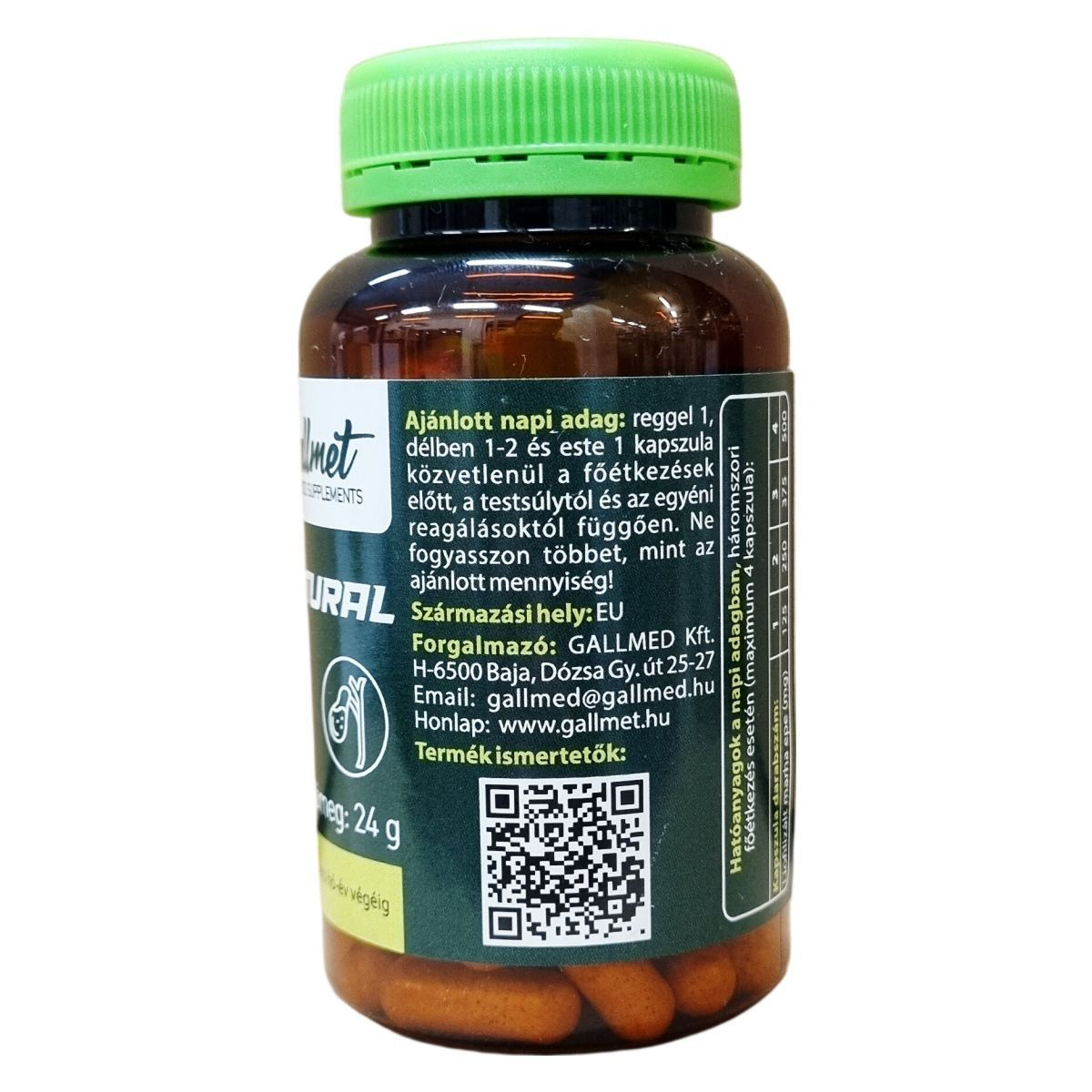 A Gallmet Natural készítmény liofilizált marha epét tartalmaz, amely természetes epesavakat biztosít. Kapszulái zselében oldódnak, így az aktív hatóanyagok hatékonyan juthatnak a szervezetbe. A termék a napi adagolás alapján 1-4 kapszulát tartalmazhat, amellyel az egyéni szükségletekhez igazítható az alkalmazás. Figyelembe kell venni, hogy a készítmény nem alkalmas heveny epepanaszok vagy epeúti elzáródás esetén, illetve terhesség idején tilos a fogyasztása. Használatakor előfordulhatnak enyhe emésztőrendszeri tünetek, mint a hasmenés vagy émelygés. A készítményt nem szabad gyermekek elől hozzáférhető helyen tartani, valamint fontos a megfelelő, hűvös tárolás. A termék hozzájárulhat az epeműködés támogatásához, azonban nem helyettesíti a kiegyensúlyozott étrendet és az egészséges életmódot.