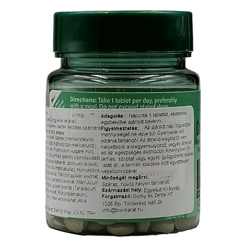Összetevők: tömegnövelő szerek (mikrokristályos cellulóz, dikalcium-foszfát, hidroxipropil-metilcellulóz), Édesköménymag kivonat ( Foeniculum vulgare mill), Édesgyökér kivonat (Glycyrrhiza glabra) csomósodást gátló anyagok (magnézium-sztearát, szilícium-dioxid), fényezőanyag (hidroxipropil-metilcellulóz), Homoktövis kivonat (Rhamnus cathartica), Tárnics gyökér kivonat (Gentiana lutea), Orvosi pemetefű kivonat (Marrubium vulgare), Gyermekláncfű gyökér kivonat (Taraxacum officinale),Rebarbara kivonat (Rheumplamatum), nedvesítőszer (glicerin), Aloe vera kivonat (Aloe barbadensis)