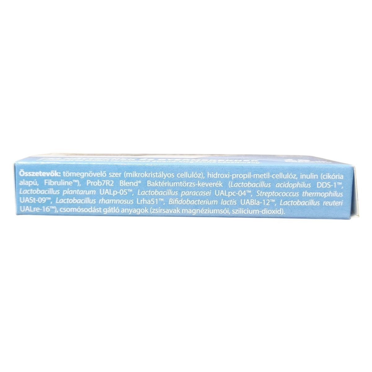 Tömegnövelő szer (mikrokristályos cellulóz), hidroxipropil-metil-cellulóz, inulin (cikória alapú, Fibruline™), Prob7R2 Blend® Baktériumtörzs-keverék (Lactobacillus acidophilus DDS-1™, Lactobacillus plantarum UALp-05™, Lactobacillus paracasei UALpc-04™, Streptococcus thermophilus UASt-09™, Lactobacillus rhamnosus Lrha51™, Bifidobacterium lactis UABla-12™, Lactobacillus reuteri UALre-16™), csomósodást gátló anyagok (zsírsavak magnéziumsói, szilícium-dioxid)