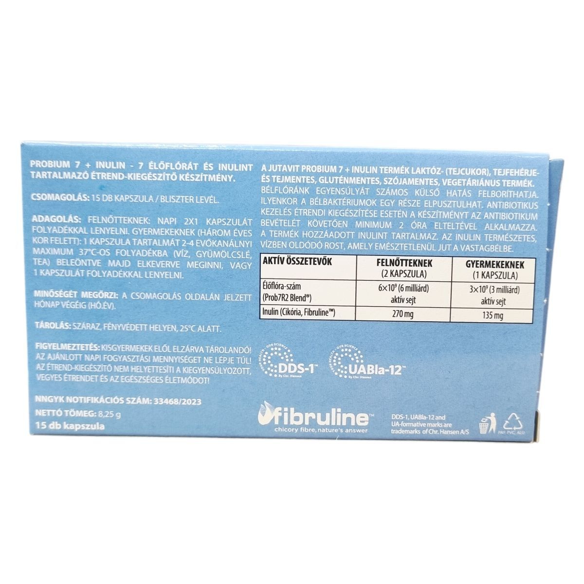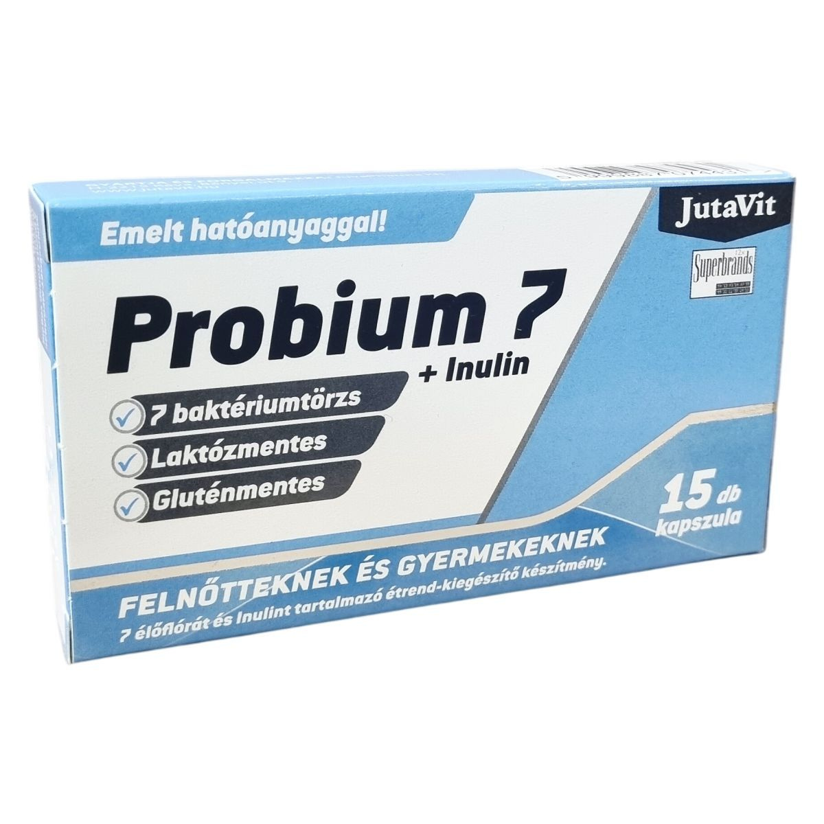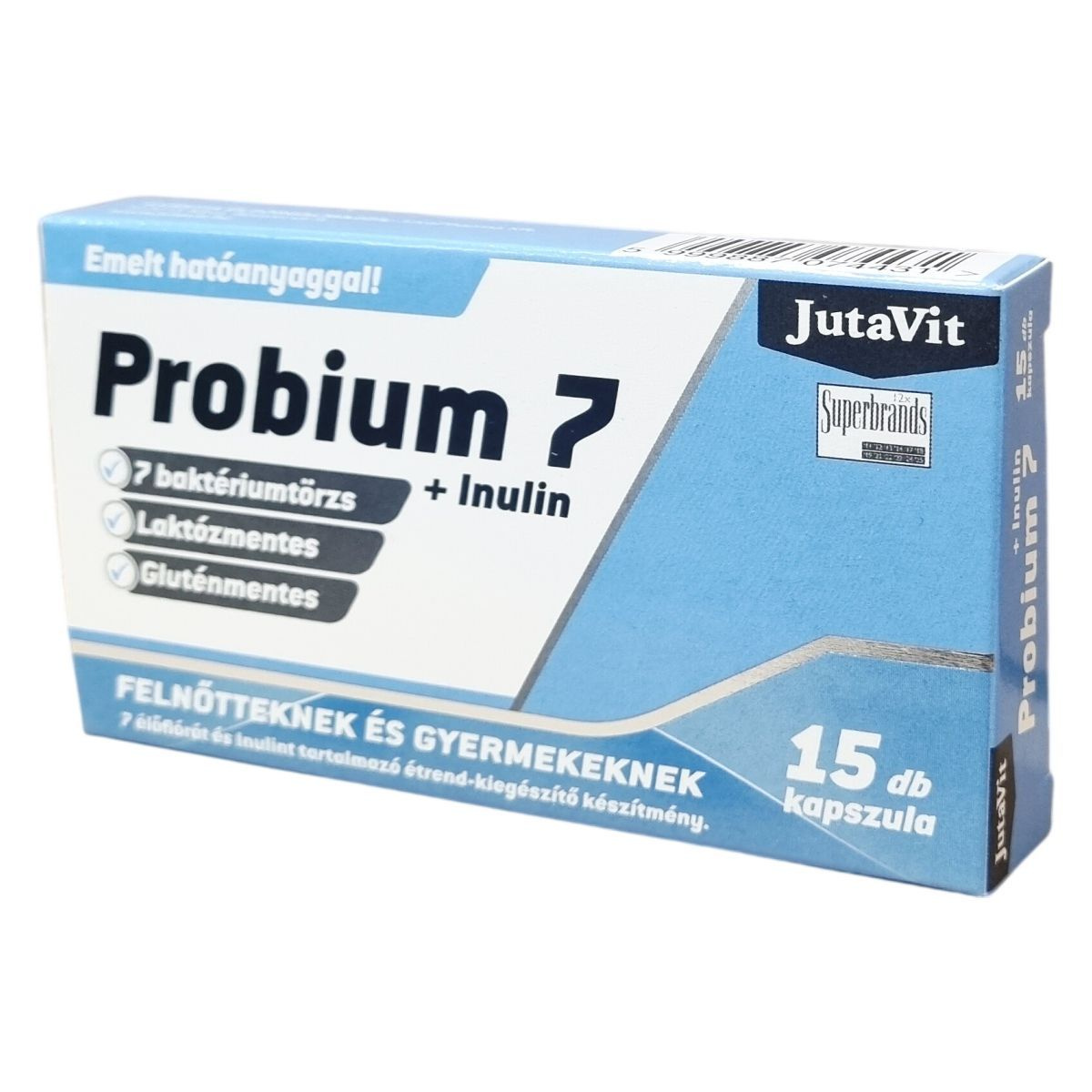 A Jutavit Probium 7 + Inulin egy laktóz-, tejfehérje- és tejmentes, gluténmentes, szójamentes, vegetáriánus étrend-kiegészítő, amely 7 különböző baktériumtörzset (Prob7R2 Blend®) és cikória alapú inulint (Fibruline™) tartalmaz. A bélflóra egyensúlyát számos külső hatás, például antibiotikumos kezelés megzavarhatja, ami során a bélbaktériumok egy része elpusztulhat. Az inulin természetes, vízben oldódó rost, amely emésztetlenül jut el a vastagbélbe, ahol támogathatja a bélflóra egészséges működését. A termék 15 kapszula/bliszter levelek csomagolásban érhető el, és mind felnőttek, mind gyermekek (3 éves kortól) számára ajánlott.