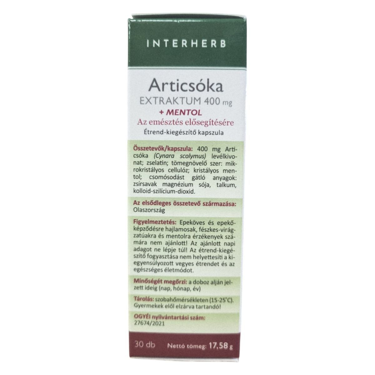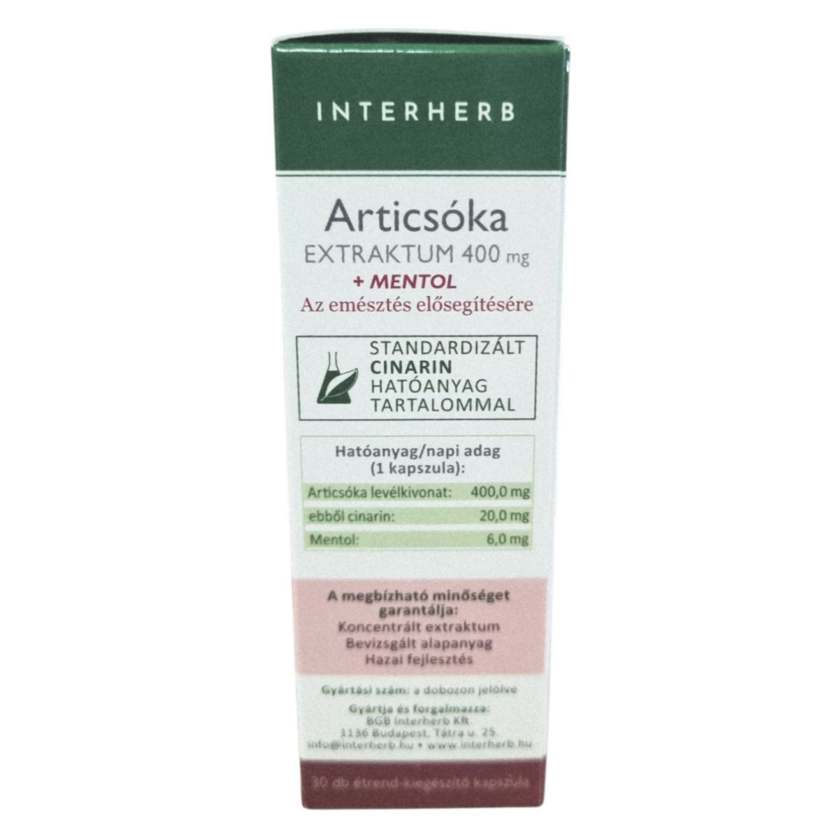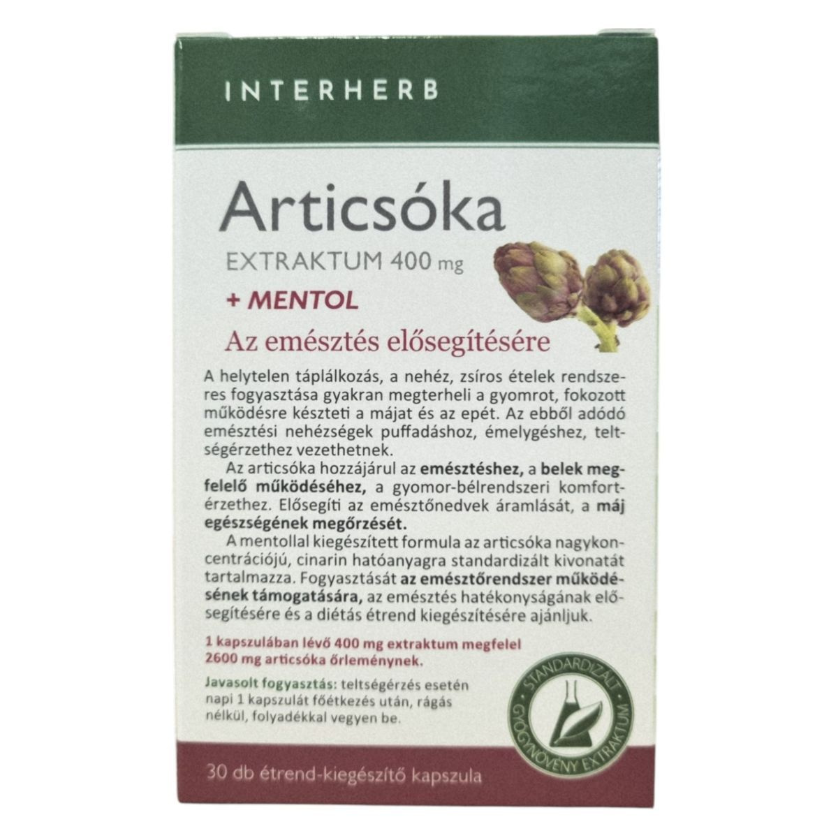 Az INTERHERB Articsóka EXTRAKTUM 400 mg + MENTOL kapszula az emésztés elősegítésére szolgálhat, különösen a helytelen táplálkozás és a nehéz, zsíros ételek fogyasztása esetén. Az articsóka hozzájárulhat a belek megfelelő működéséhez és a gyomor-bélrendszeri komfortérzethez. A termék standardizált cinarin hatóanyagot tartalmaz, amely elősegítheti az emésztőnedvek áramlását és a máj egészségének megőrzését. A mentollal kiegészített formula a diétás étrend kiegészítésére is ajánlott. Az elsődleges összetevő származása Olaszország.