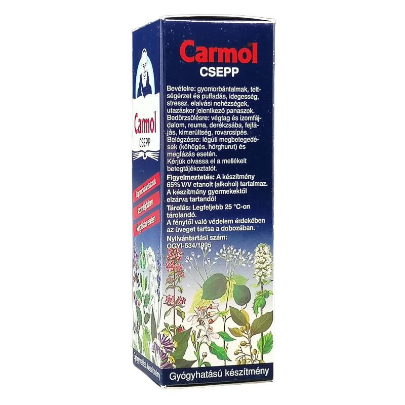 Használata: Puffadás, teltségérzet, emésztési zavarok, fejfájás esetén: 10-20 csepp Carmol-t kockacukorra, teába vagy vízbe csepegtetni. Idegi eredetű elalvási nehézség esetén: lefekvés előtt 10-20 csepp Carmol-t egy csészényi teába vagy meleg cukros vízbe csepegtetni. Utazáskor jelentkező panaszok esetén: 2-3 csepp Carmol kockacukorra vagy vízbe csepegtetve oldhatja a feszültséget. Idegesség esetén: naponta 3-szor 10-20 csepp. Megfázás esetén: naponta maximum 5-ször 10-20 csepp Carmol-t kockacukorra vagy teába csepegtetni. Fejfájás esetén: belsőleges alkalmazás mellett a homlokot, halántékot és tarkót bedörzsölni. Végtagfájdalom esetén: a fájó testrészeket naponta legfeljebb 5-ször bedörzsölni és melegen tartani. Légúti megbetegedések esetén: 20 csepp Carmol-t forró teába csepegtetni és a gőzöket belélegezni (inhalálni), végül a teát lassan meginni. A mellkas és hát lefekvés előtti bedörzsölése könnyítheti a légzést. Bőrviszketés, rovarcsípés esetén: az érintett területekre 1-2 csepp Carmol cseppenteni (nem kell bedörzsölni).