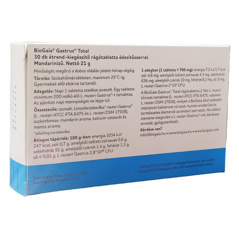 Adagolás: Napi 1 tabletta szedése javasolt. Egy tabletta minimum 200 millió élő Lactobacillus reuteri Gastrus-t tartalmaz. Kúraszerűen legalább 30 napig javasolt a szedése, de a kúra eltarthat akár három hónapig is. Antibiotikum-kezelés esetén fontos, hogy a BioGaia Gastrus Totalt két antibiotikum között vegye be, ne az antibiotikummal egyidőben.
