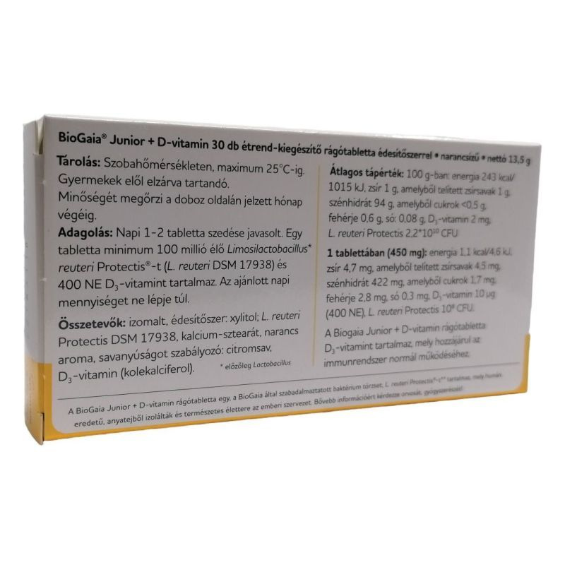 A BioGaia Junior + D-vitamin rágótabletta D3-vitamint tartalmaz, mely hozzájárul az immunrendszer normál működéséhez.