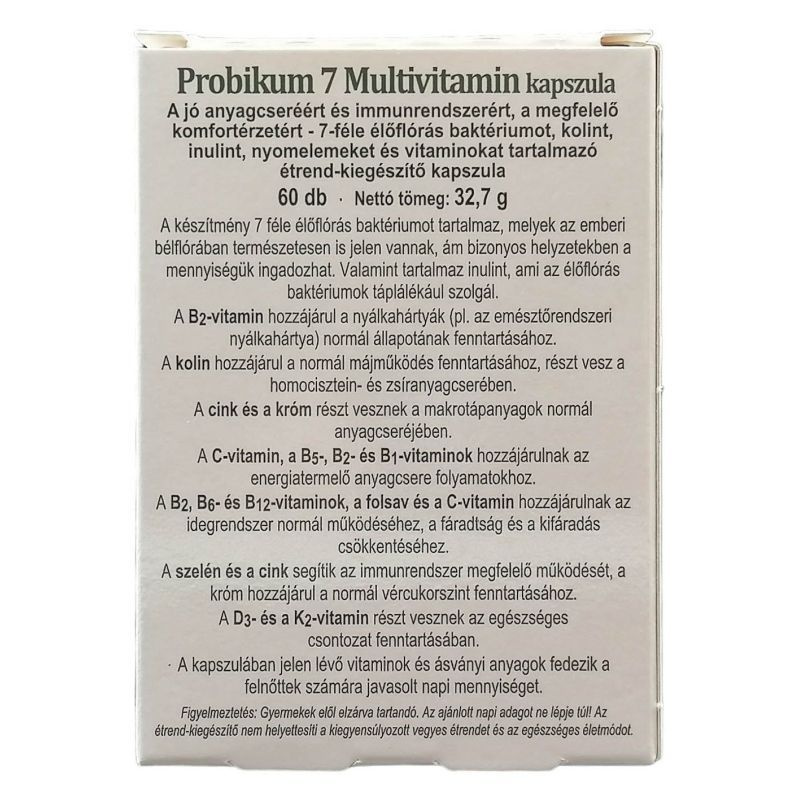 Élőflórát, inulint, vitaminokat és nyomelemeket tartalmazó speciális gyógyászati célra szánt tápszer. A Probikum7 élőflórás Multivitamin alkalmazása javasolt antibiotikus kezelést követően és bélrendszeri fertőzések után aktív baktériumok, egyes vitaminok és ásványi anyagok pótlására. Adagolás: Napi 2 x 1 szükség esetén 2 x 2 kapszula bőséges folyadékkal lenyelve, reggeli előtt és vacsora után.