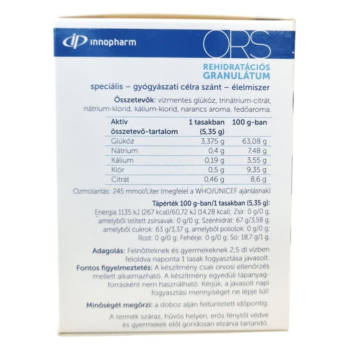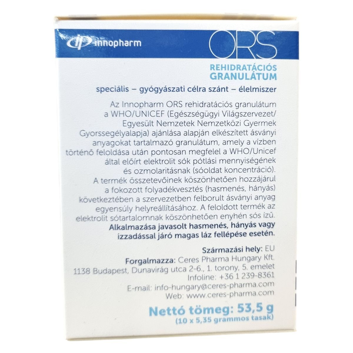 Az Innopharm ORS rehidratációs granulátum a WHO/UNICEF ajánlásával készült ásványi anyagokat tartalmazó ásványianyag- és elektrolit pótló granulátum. Vízben feloldva megfelel a WHO/UNICEF által előírt elektrolit sók pótlási mennyiségének és ozmolaritásának (245 mmol/liter). A termék összetevői segíthetik a fokozott folyadékvesztés, például hasmenés, hányás vagy izzadással járó magas láz esetén a szervezet ásványi anyag egyensúlyának helyreállítását. A feloldott oldat enyhén sós ízű. A termék nettó tömege 53,5 g, mely 10 darab 5,35 grammos tasakot tartalmaz.