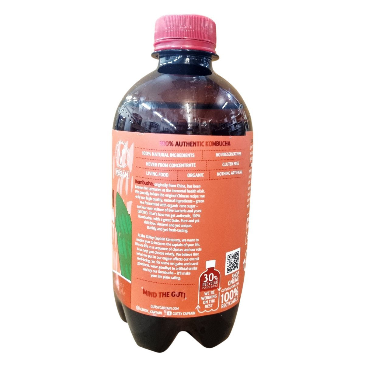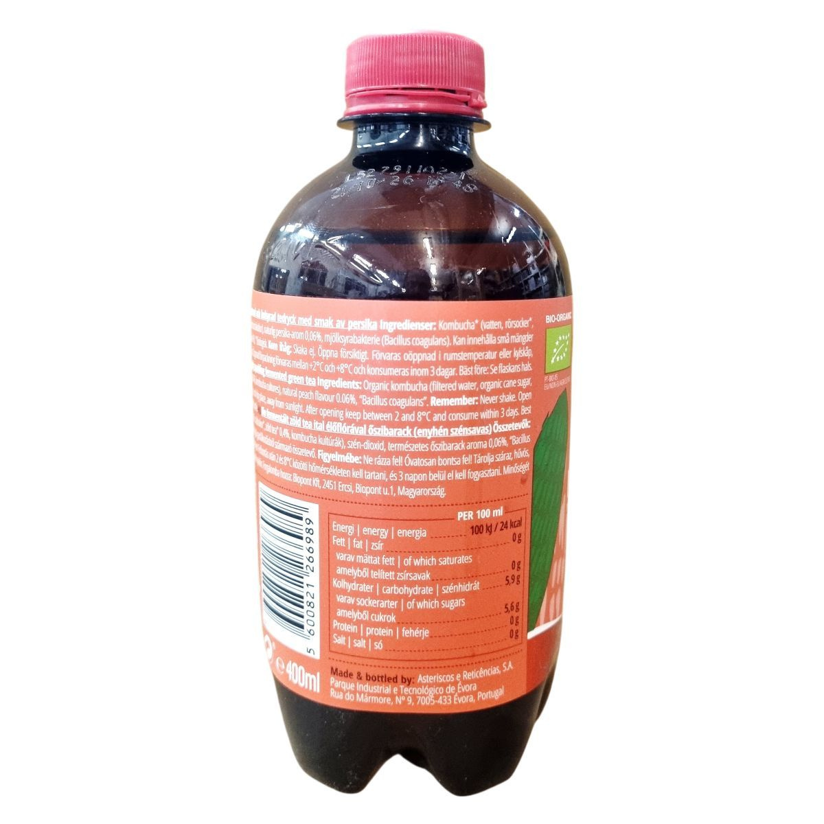 kombucha (szűrt víz, nádcukor*, zöld tea* 0,4%, kombucha kultúrák), szén-dioxid, természetes őszibarack aroma 0,06%, Bacillus coagulans