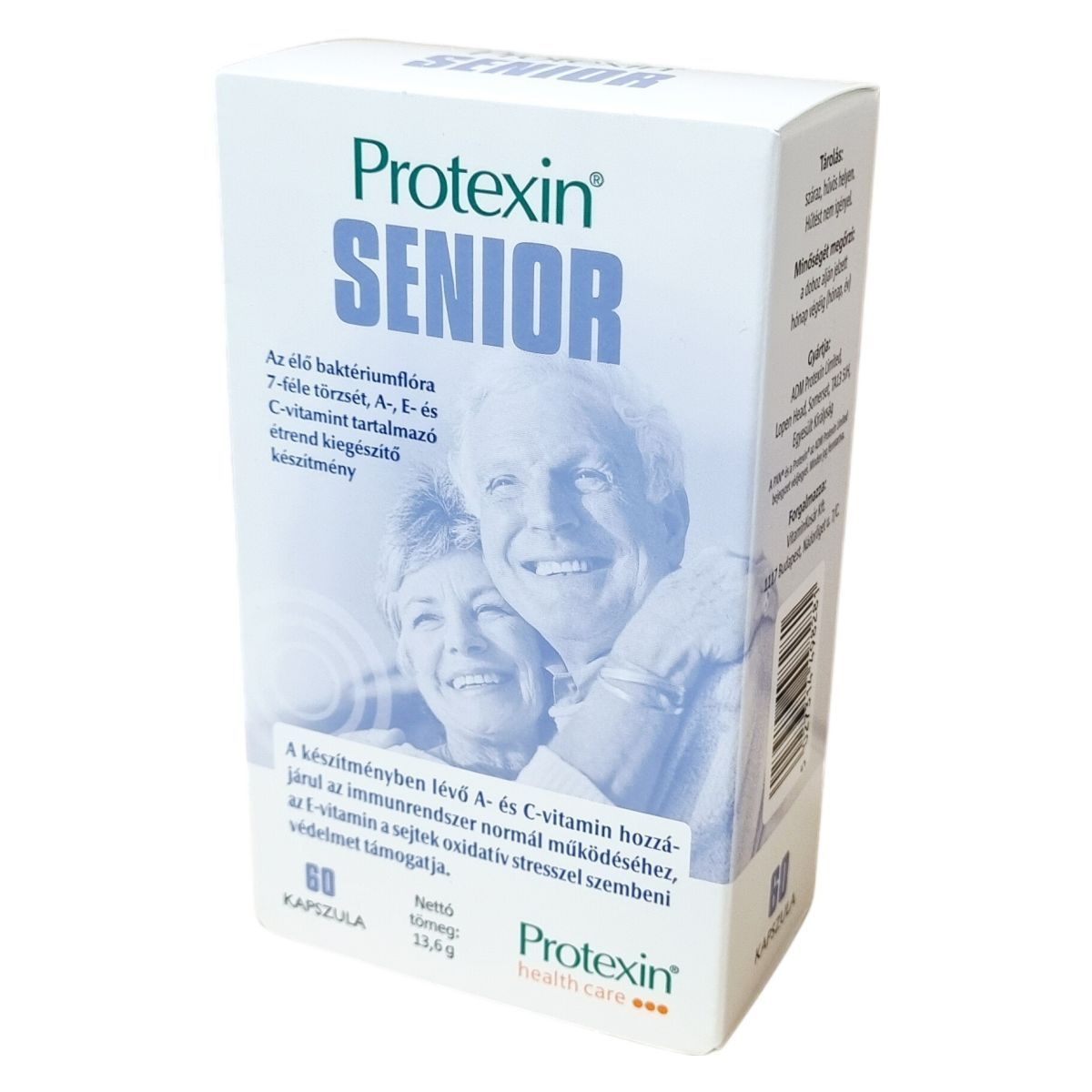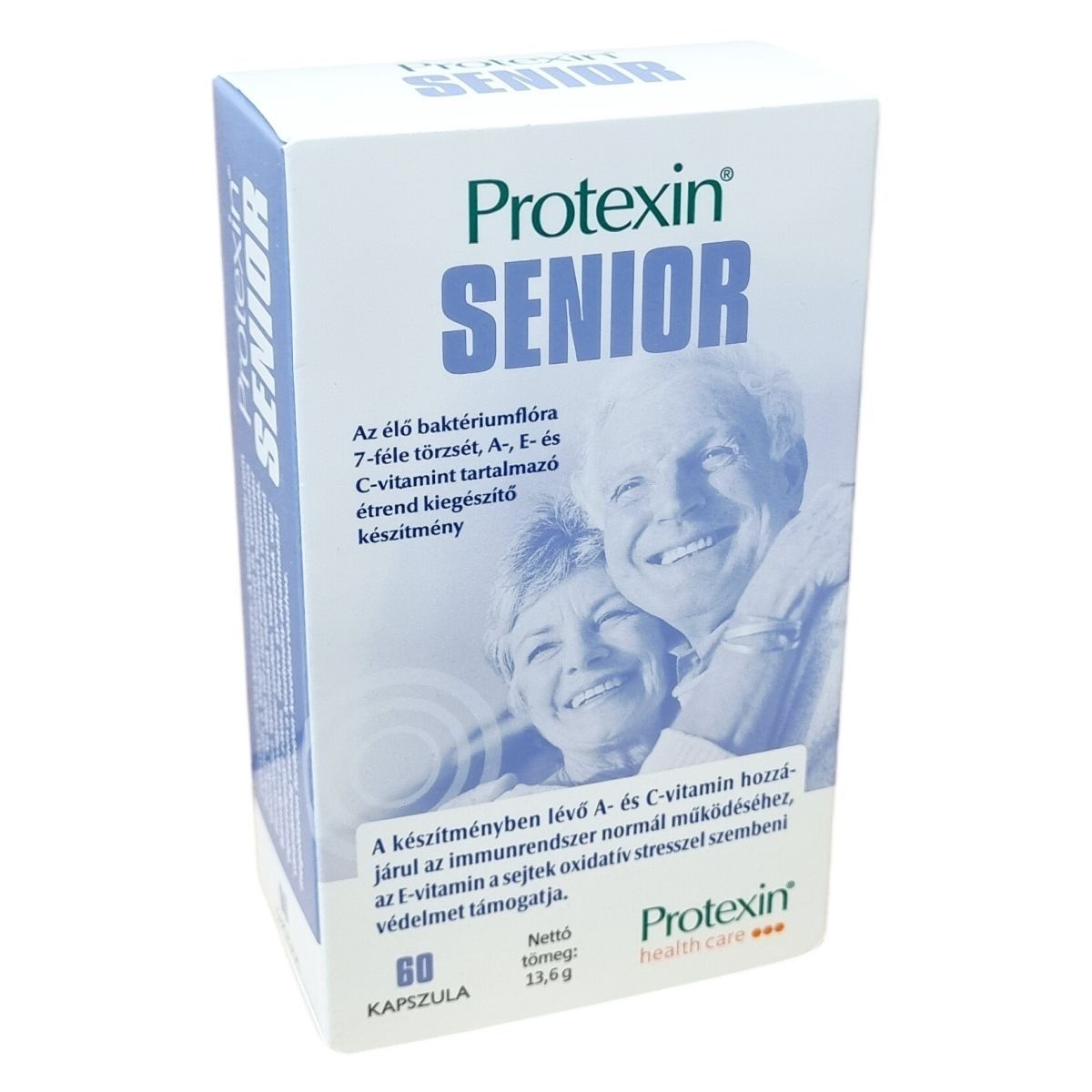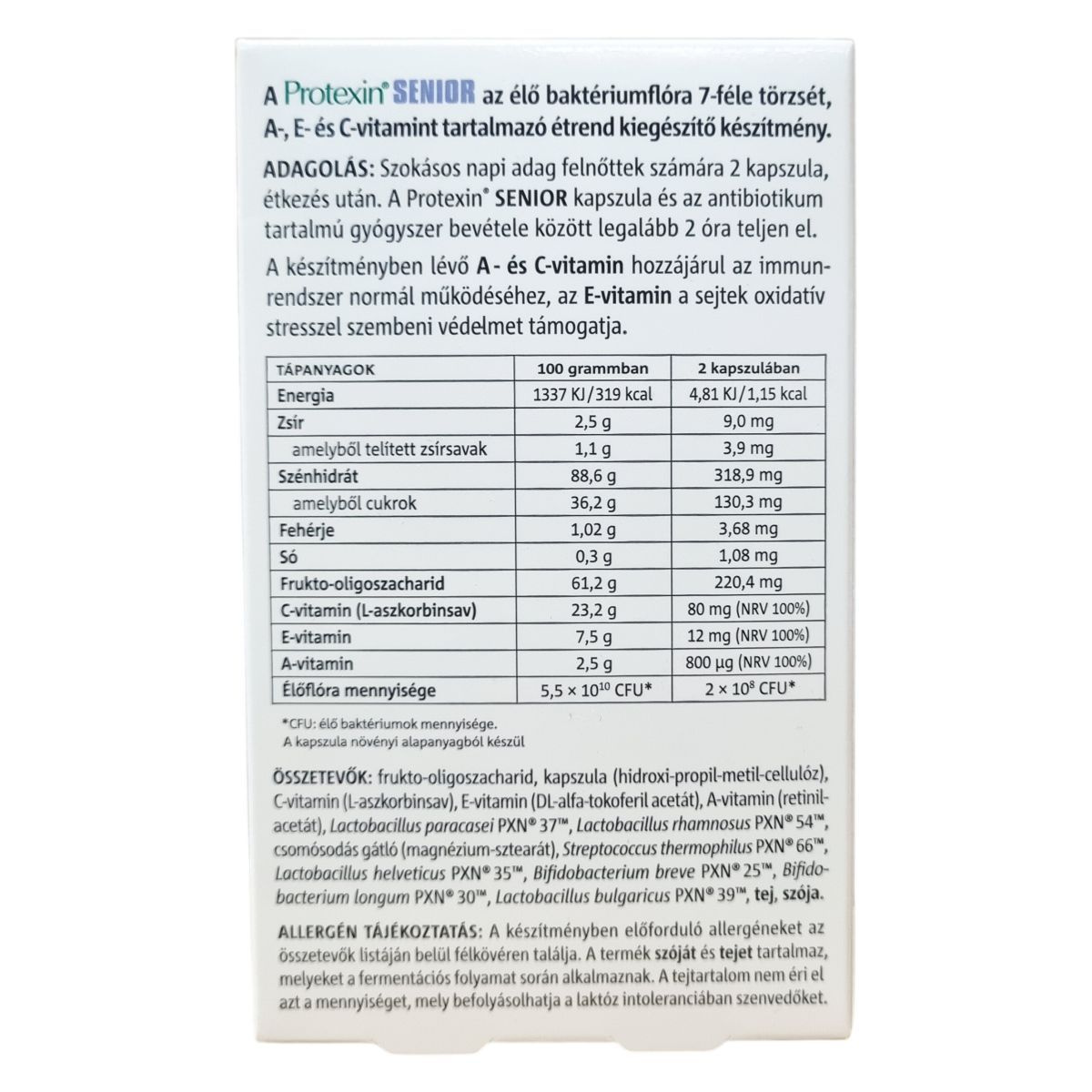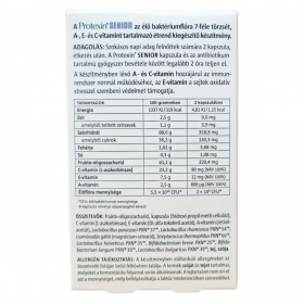 A Protexin® SENIOR egy speciális étrend-kiegészítő, amely hétféle élő baktériumtörzset, valamint a szervezet működését támogató A-, E- és C-vitaminokat tartalmaz. A készítmény kapszulája növényi alapanyagból készül, és célja az immunrendszer támogatása és a sejtek oxidatív stressz elleni védelme. Az élőflóra mennyisége jelentős, biztosítva a probiotikus hatást. Az adagolás felnőttek részére napi két kapszula, lehetőség szerint étkezés után, és figyelemmel kell lenni arra, hogy antibiotikum szedése esetén legalább két óra teljen el a két készítmény bevétele között. A termék szóját és tejet tartalmaz, melyek a fermentációs folyamat során kerülnek bele, azonban a tejtartalom nem befolyásolhatja a laktózintoleranciában szenvedőket. A készítmény nem helyettesíti a változatos és kiegyensúlyozott étrendet, és gyermekek elől elzárva tartandó. Bármilyen egészségi probléma, gyógyszerszedés vagy várandósság esetén javasolt a termék használata előtt orvossal konzultálni.