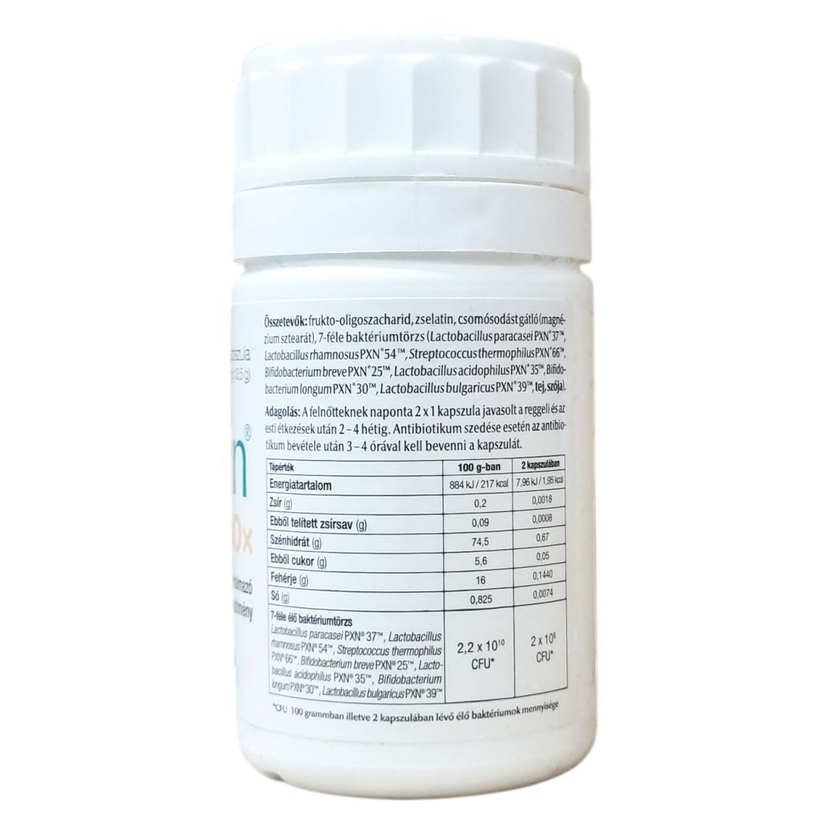 frukto-oligoszacharid, zselatin, csomósodásgátló (magnézium-sztearát), Lactobacillus paracasei PXN®37™, Lactobacillus rhamnosus PXN®54™, Streptococcus thermophilus PXN®66™, Bifidobacterium breve PXN®25™, Lactobacillus acidophilus PXN®35™, Bifidobacterium longum PXN®30™, Lactobacillus bulgaricus PXN®39™, tej, szója