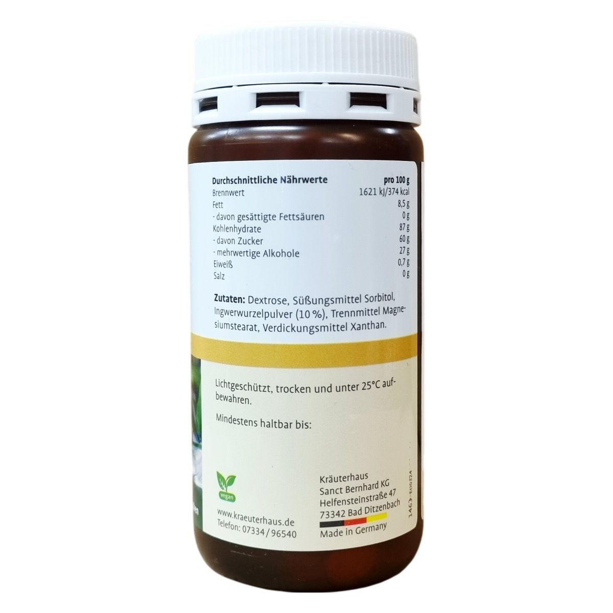 töltőanyag (dextróz), édesítőszer (szorbit), gyömbérgyökérpor (10%), csomósodást gátló (zsírsavak magnéziumsói), sűrítőanyag (xantán)