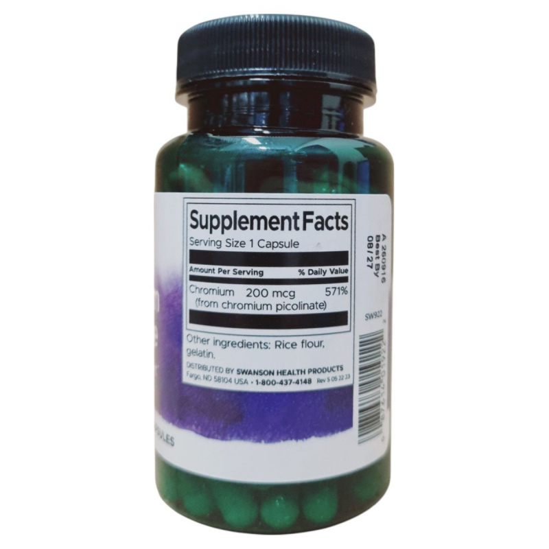 A Swanson KRÓM pikolinát étrend-kiegészítő kapszulánként 200 mcg krómot tartalmaz, amely hozzájárulhat a normál vércukorszint fenntartásához. A termék rizslisztet és zselatint is tartalmaz, és 100 kapszulás kiszerelésben kapható. A napi ajánlott mennyiség 1 kapszula, amelyet nem szabad túllépni. A termék nem helyettesíti a vegyes étrendet és az egészséges életmódot. Fontos, hogy a dobozt gyermekek elől elzárva tartsuk, és terhesség vagy szoptatás alatt a fogyasztása nem ajánlott. A terméket száraz, hűvös helyen kell tárolni. A gyártó Swanson Health Products, és a termék OGYÉI nyilvántartási száma 21262/2019.