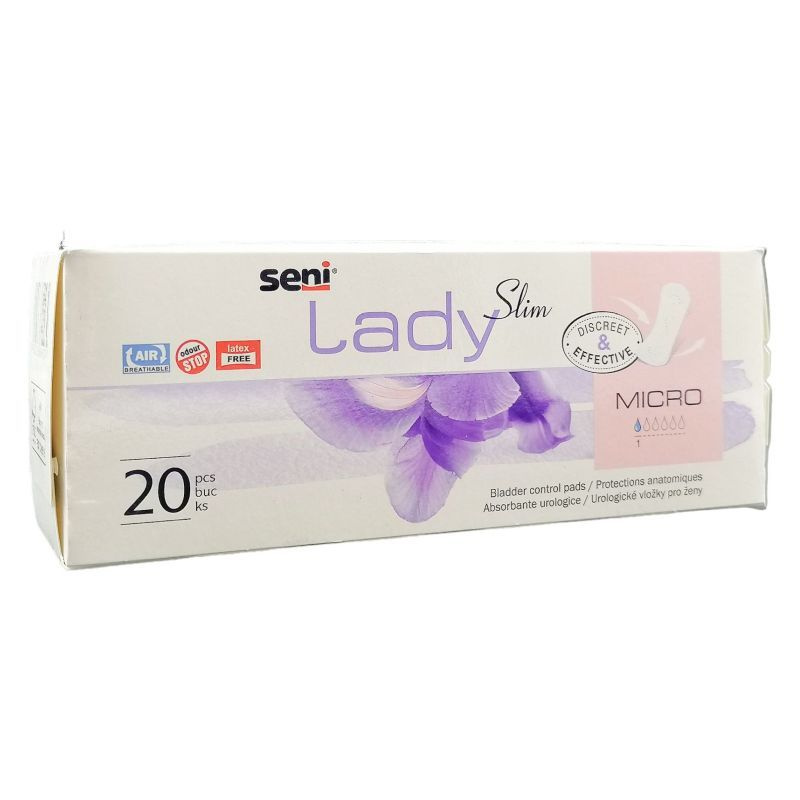 A légáteresztő, anatómiailag formált SENI LADY SLIM MICRO inkontinencia betét megfelelő és elegendő megoldás csepegéses inkontinencia esetén: igazodik a test vonalához, semlegesíti a kellemetlen szagokat, légáteresztő kivitelével engedi a bőrt szellőzni, egyszerűen és biztosan rögzíthető a fehérneműhöz, kényelmet és diszkréciót garantál.