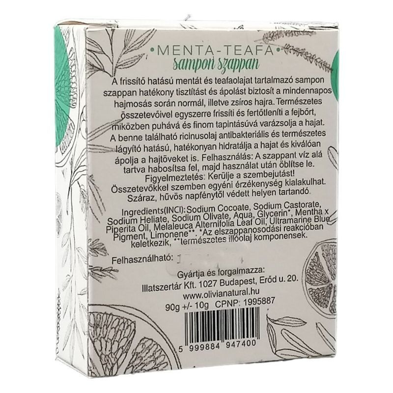 ÖSSZETÉTEL (INCI): Sodium Cocoate (elszappanosított kókuszzsír), Sodium Heliate (elszappanosított napraforgóolaj), Sodium Olivate (elszappanosított olívaolaj), Sodium Castorate (elszappanosított ricinusolaj), Aqua (víz), Mentha x Piperita Oil (borsmenta illóolaj), Melaleuca Alternifolia Leaf Oil (ausztrál teafaolaj), CI 77007 (kék pigment).