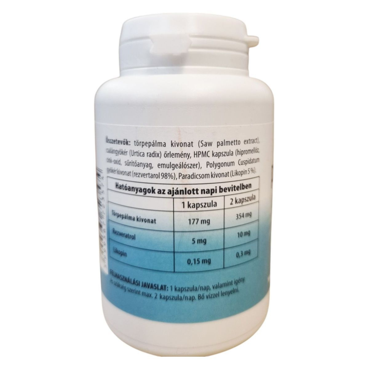 Törpepálma kivonat (Saw palmetto extract), csalángyökér (Urtica radix) őrlemény, HPMC kapszula (hipromellóz, cink-oxid, sűrítőanyag, emulgeálószer), Polygonum Cuspidatum gyökér kivonat (rezveratrol 98%), Paradicsom kivonat (Likopin 5%).