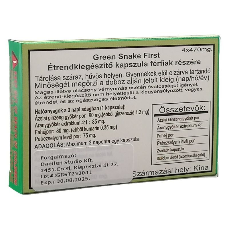 A Green Snake kizárólag természetes növényi összetevőkből áll és az évezredekre visszanyúló kínai orvoslás egyik leghatásosabb férfi potencianövelő anyaga volt. Segíthet azon férfiaknak, akik szeretnének biztos, természetes megoldást találni a potenciazavarukra vagy csak szeretnének olyan Extra "energiához jutni, mellyel nyugodtan és nagy biztonsággal kápráztathatják el a partnerüket.