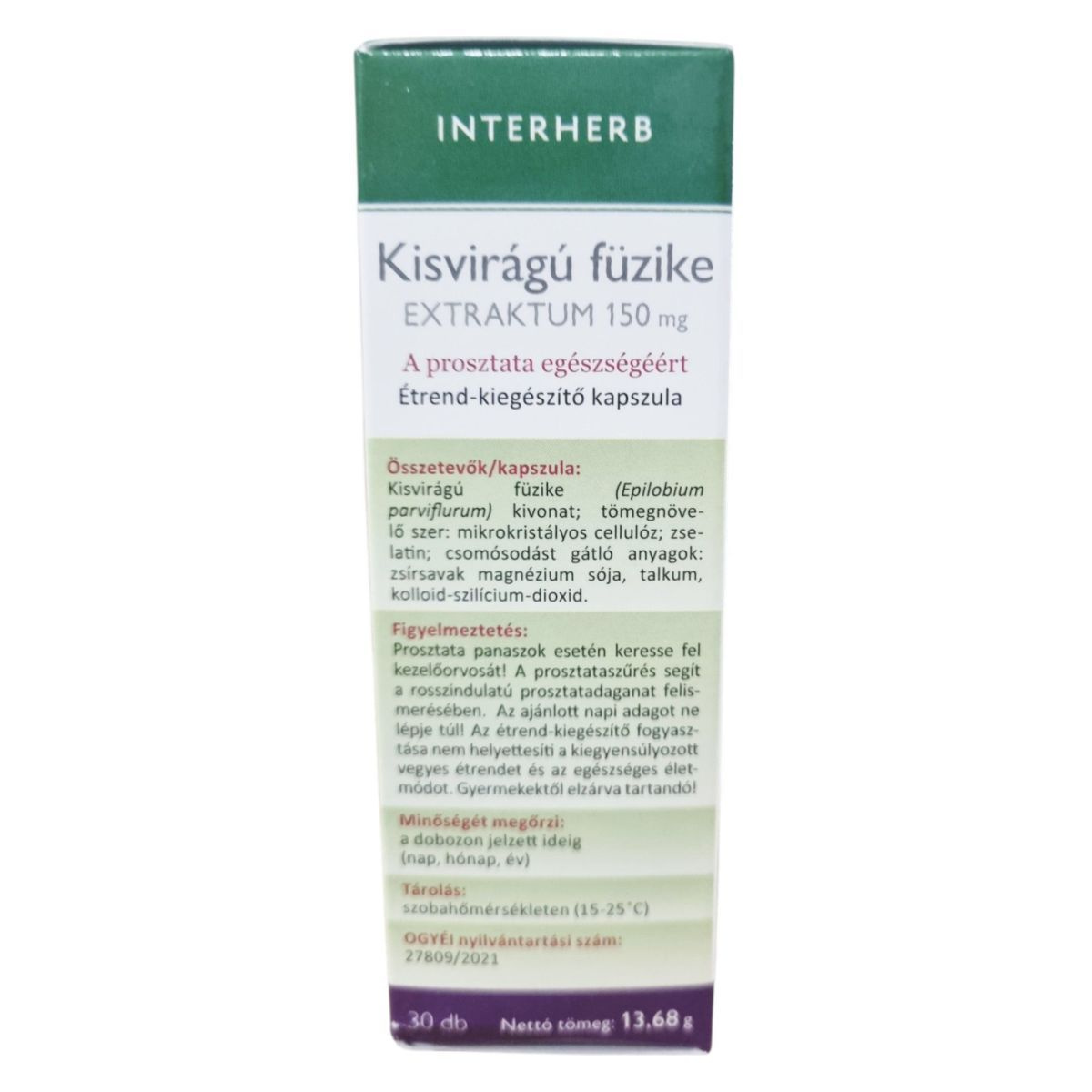 Az INTERHERB Kisvirágú füzike EXTRAKTUM 150 mg kapszula egy standardizált flavonoid hatóanyag tartalmú étrend-kiegészítő, amely a prosztata egészségének támogatására szolgálhat. A termék koncentrált extraktumot tartalmaz, amely 150 mg kivonat formájában 1500 mg növényi őrleménynek felel meg. A megbízható minőséget a bevizsgált alapanyag és a hazai fejlesztés garantálja. A termék 30 db kapszulát tartalmaz, és a gyártási szám a dobozon van feltüntetve.