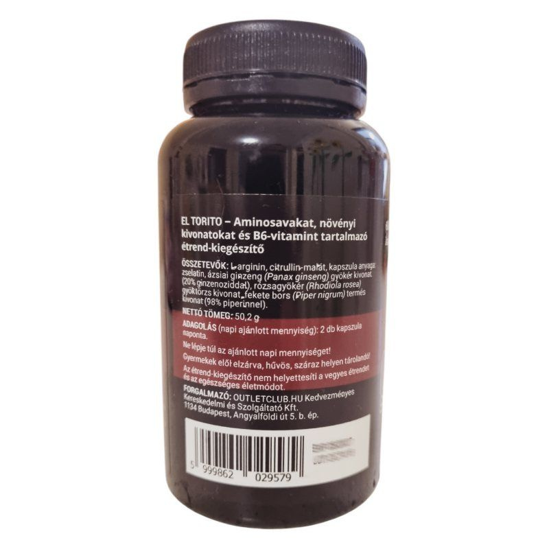 Az El Torito étrend-kiegészítő kapszula aminosavakat (L-arginin, citrullin-malát), növényi kivonatokat (ázsiai ginzeng, Rhodiola rosea) és B6-vitamint tartalmaz. A ginzeng hozzájárulhat a fáradtság csökkentéséhez, a libidó és az állóképesség támogatásához, valamint a kognitív funkciók fenntartásához. A Rhodiola kivonat segíthet a stressz kezelésében, míg a fekete bors kivonat piperintartalmával fokozhatja a tápanyagok hasznosulását. A B6-vitamin hozzájárul a normál energiatermelő anyagcsere-folyamatokhoz, az idegrendszer normál működéséhez, a fáradtság és kifáradás csökkentéséhez.