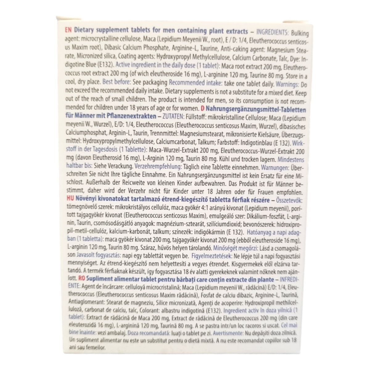 Növényi kivonatokat tartalmazó étrend-kiegészítő férfiaknak, amely maca-gyökérrel, tajgagyökérrel, L-argininnel és taurinnal segítheti a vitalitás fenntartását és a fizikai teljesítőképesség támogatását.