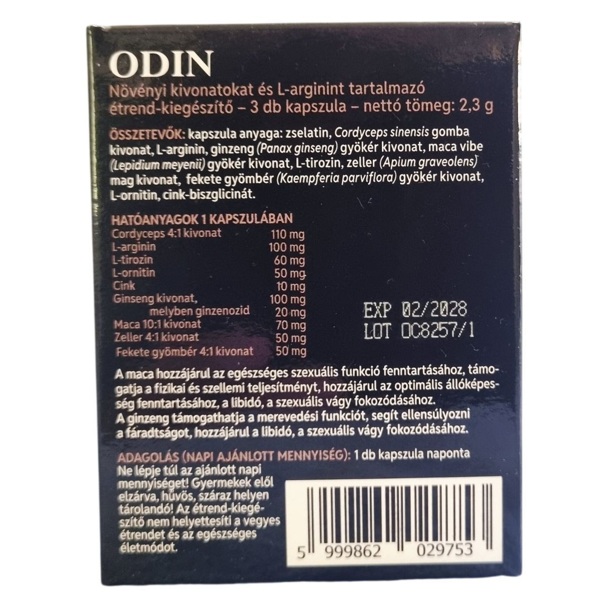 Az ODIN kapszula hatóanyagként több növényi kivonatot és aminosavat egyesít, mint például Cordyceps sinensis gomba kivonat, L-arginin, L-tirozin, L-ornitin, valamint fontos ásványi anyagként cink-biszglicinát. A maca kivonat hozzájárul az egészséges szexuális funkció fenntartásához, támogathatja a fizikai és szellemi teljesítményt, elősegítheti az optimális állóképesség fenntartását, valamint fokozhatja a libidót és a szexuális vágyat. A ginzeng szintén támogathatja a merevedési funkciót, segíthet ellensúlyozni a fáradtságot és hozzájárulhat a libidó fokozódásához. A készítmény zselatin kapszulában kerül forgalomba, mindössze napi egy kapszula bevételével javasolt használata. Az étrend-kiegészítő nem helyettesíti a kiegyensúlyozott táplálkozást és az egészséges életmódot, továbbá gyermekek elől elzárva, hűvös és száraz helyen kell tárolni.