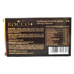 A ROCCO+ kapszula egy átfogó étrend-kiegészítő férfiak számára, mely 6 db kapszulát tartalmaz, egyenként 500 mg-os kiszerelésben. Származási helye Thaiföld, és komplex hatóanyag-formulájában több természetes kivonat és ásványi anyag is megtalálható, mint a cordyceps, reishi gomba, fekete gyömbér, osztriga, gyömbér, maca por, valamint likopin és cink aminosav kelát. A termék célja, hogy hozzájárulhasson a férfiak általános jólétéhez. Az egy kapszulában található hatóanyagok mennyisége precízen kerül kimérésre. A termék fogyasztását naponta egyszer javasolják, lehetőleg éhgyomorra, egy pohár vízzel, az ajánlott mennyiség túllépése nélkül. Felhívják a figyelmet arra, hogy a kapszula használata nem ajánlott 18 év alattiaknak, magas vérnyomással, illetve szív- és érrendszeri betegségekkel küzdőknek, és gyermekektől elzárva kell tartani. A kapszulák fénytől és melegről elzárva tárolandók a minőség megőrzése érdekében.
