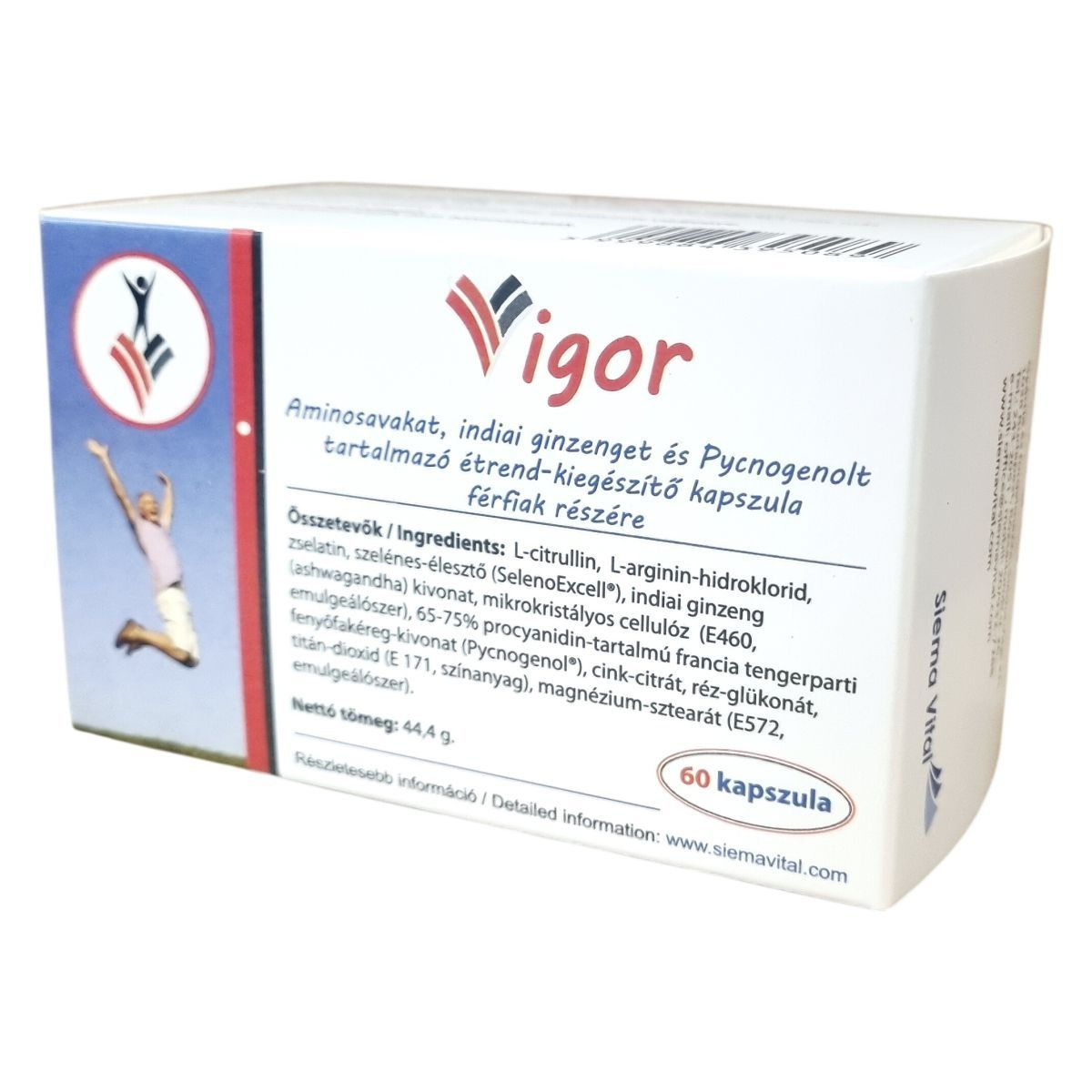 A Vigor kapszula olyan összetevőket tartalmaz, mint L-citrullin, L-arginin-hidroklorid, szelénes-élesztő (SelenoExcell®), indiai ginzeng (ashwagandha) kivonat, valamint a 65-75% procyanidin-tartalmú francia tengerparti fenyőfakéreg-kivonat (Pycnogenol®). A Pycnogenol® a Horphag Research Ltd. bejegyzett védjegye, alkalmazását több amerikai és nemzetközi szabadalom védi. A SelenoExcell® a Cypress Systems, Inc. bejegyzett védjegye. A termék 60 kapszulás kiszerelésben kerül forgalomba, és az adagolás naponta két kapszula. A készítmény tartalmaz zselatint és emulgeálószereket (mikrokristályos cellulóz, magnézium-sztearát), valamint titán-dioxidot, mint színanyagot. A termék kizárólag felnőttek részére ajánlott, 12 év alattiak, terhes és szoptató nők számára nem használható.