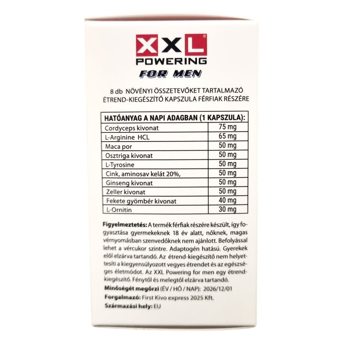 A termék férfiak részére készült, így fogyasztása gyermekeknek 18 év alatt, nőknek, magas vérnyomásban szenvedőknek nem ajánlott. Befolyással lehet a vércukorszintre. Adaptogén hatású. Gyerekek elől elzárva tartandó. Az étrend-kiegészítő nem helyettesíti a kiegyensúlyozott vegyes étrendet és az egészséges életmódot.