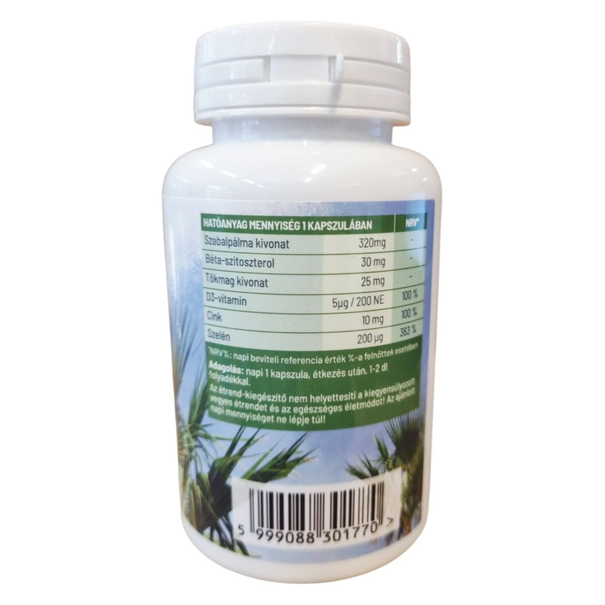 Szabalpálma kivonat 320 mg, Béta-szitoszterol 30 mg, Tökmag kivonat 25 mg, D3-vitamin 5 µg / 200 NE 100%, Cink 10 mg 100%, Szelén 200 µg 363%