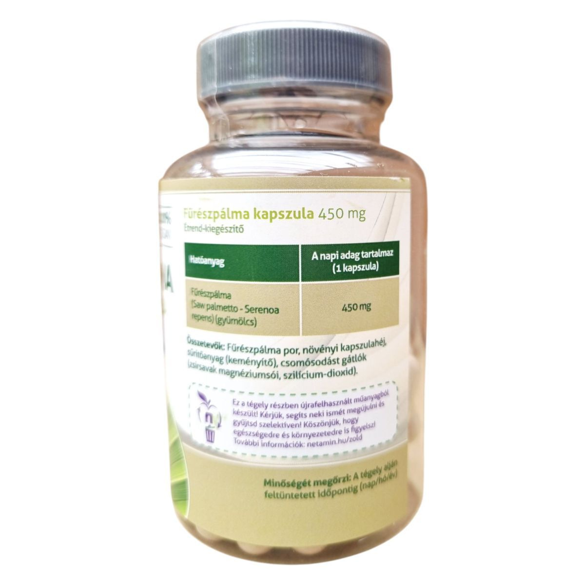 A Netamin Fűrészpálma kapszula 450 mg fűrészpálma gyümölcsport tartalmaz, amely hozzájárulhat a prosztata egészségének támogatásához. A termék 100% vegán, és részben újrahasznosított műanyagból készült csomagolásban érkezik.