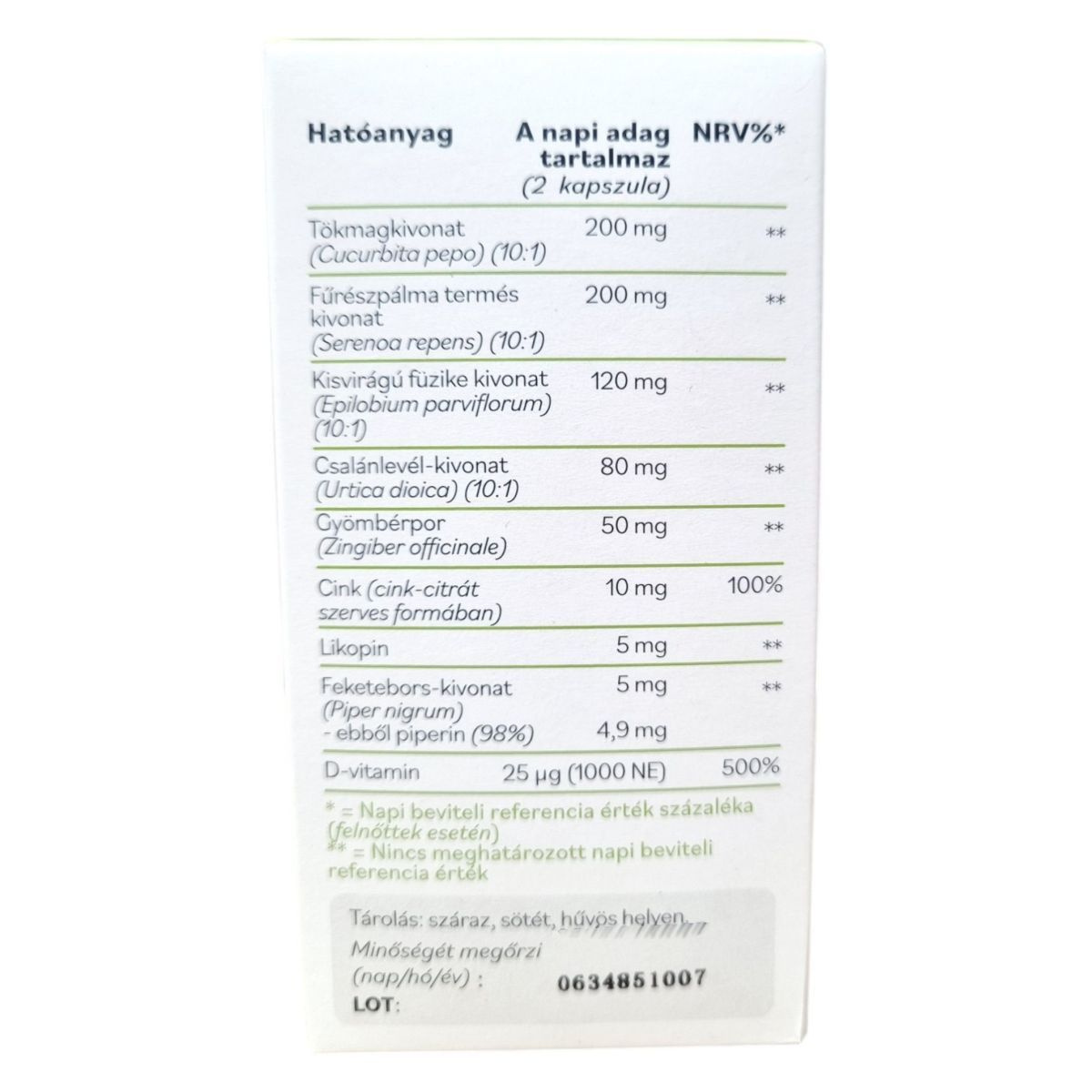 Emulgeálószer (mikrokristályos cellulóz), kapszulahéj (hidroxipropil-metilcellulóz), tökmagkivonat (Cucurbita pepo), fűrészpálma termés kivonat (Serenoa repens), kisvirágú füzike kivonat (Epilobium parviflorum), csalánlevél-kivonat (Urtica dioica), gyömbérpor (Zingiber officinale), likopin, cink-citrát, csomósodást gátló anyagok (zsírsavak magnéziumsói, szilícium-dioxid), D-vitamin (kolekalciferol), feketebors-kivonat (Piper nigrum).