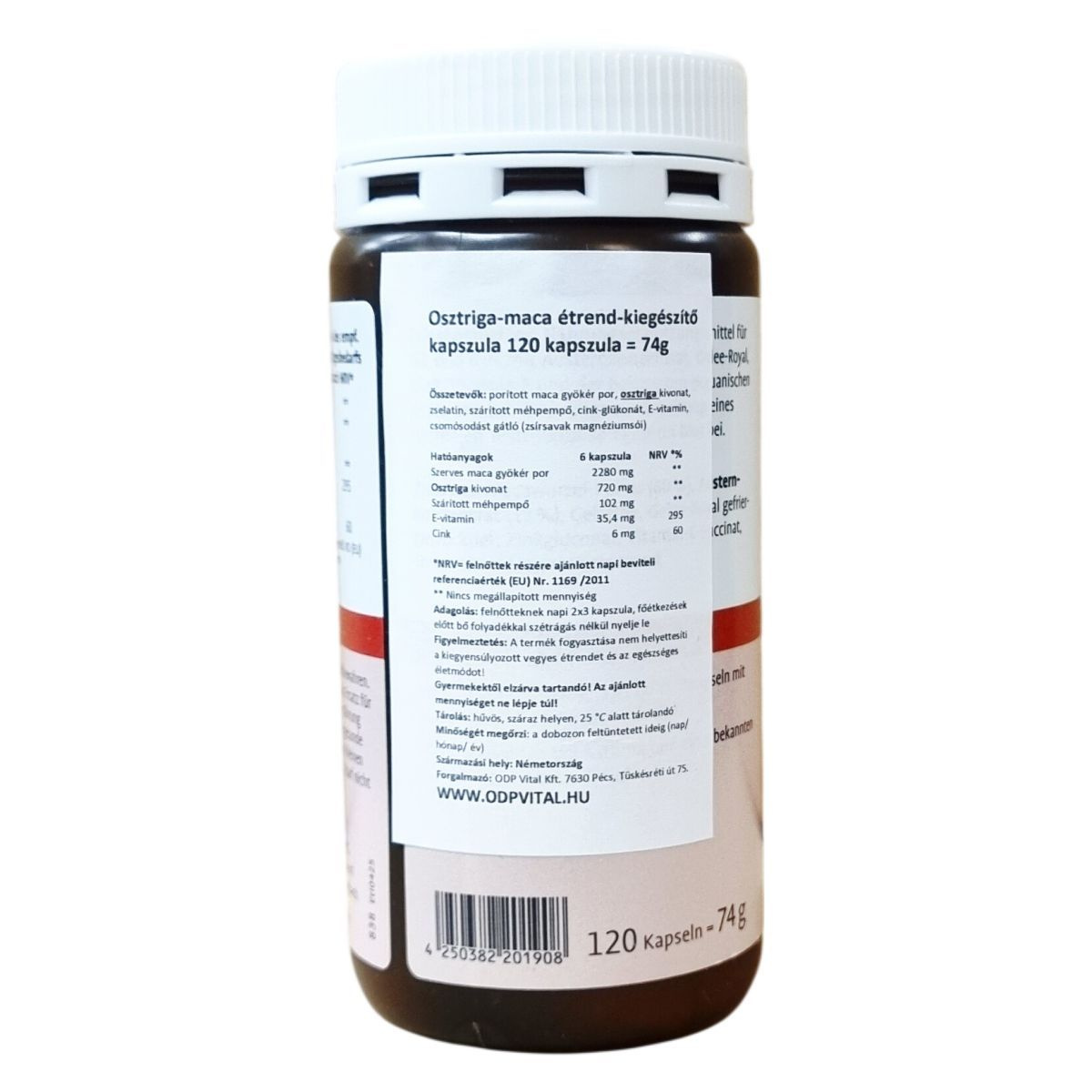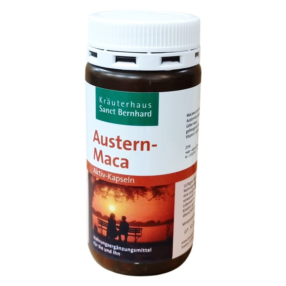 Az osztriga-maca Aktiv-Kapseln kapszula porított maca gyökér porból, osztriga koncentrátumból, zselatinnal bevont kapszulában, valamint szárított méhpempőből, cink-glükonátból és E-vitaminból áll. A készítmény csomósodást gátló anyagot, zsírban oldódó magnéziumsókat is tartalmaz. A terméket Németországban gyártják és főként felnőttek számára ajánlják. Az étrend-kiegészítő adagolása napi 6 kapszula, amely főétkezések előtt bő folyadékkal, egészben lenyelhető. Az ajánlott napi beviteli referenciák közül az E-vitamin 295%-át, a cink 60%-át tartalmazza, míg a maca gyökér, osztriga kivonat és méhpempő esetében nem áll rendelkezésre hivatalos referenciaérték. A termék nem helyettesíti az egészséges és változatos étrendet, valamint egy egészséges életmódot, és gyermekektől elzárva kell tartani.