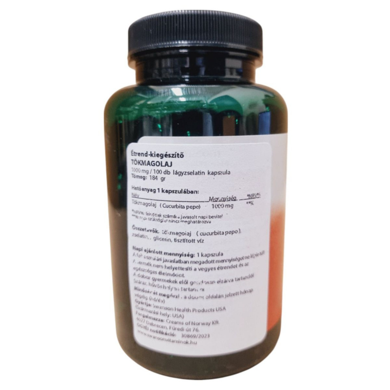 A Swanson Tökmagolaj kapszula 1000 mg tökmagolajat tartalmaz, amelyet a Cucurbita pepo növényből nyernek. A termék lágyzselatin kapszulák formájában kapható, és napi egy kapszula fogyasztása javasolt. A termék nem helyettesíti a vegyes étrendet és az egészséges életmódot, és fontos, hogy a dobozt gyermekek elől elzárva tartsuk. A kapszulák összetevői között megtalálható a zselatin, glicerin és tisztított víz. A termék gyártója a Swanson Health Products, és az OGYÉI notifikációs száma 30869/2023.