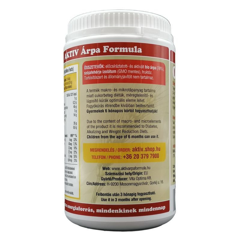 Fogyasztása: 1 adag elkészítése: keverjünk 2 evőkanál (20g) Árpa Formulát 2-3 dl rostos üdítőbe, hideg teába, tejbe, joghurtba, kefirbe. Majd mixer pohárban rázzuk fel, és máris fogyasztható a laktató ital. Kalória tartalma: 70kCal/adag. Az aktív árpa formulát, jótékony élettani hatásai miatt, ajánljuk még szív és érrendszeri betegeknek, magas koleszterinszint esetén, asztmásoknak, ekcémásoknak, durva pattanásos bőrűeknek, cukorbetegeknek, fogyókúrázóknak, vérszegényeknek, fáradékonyaknak, ízületi bántalmakban szenvedőknek, gyomor, bélrendszeri betegeknek. Székrekedéssel, emésztési problémákkal küszködőknek. Az aktív árpa formula miben különbözik a többi táplálék-kiegészítőtől? Abban, hogy nem táplálék-kiegészítő, hanem komplex táplálék. Az emberek tudják, hogy vitamin és ásványi anyag pótlásra szorulnak, mert az utóbbi 100 évben ételeink minősége sokat romlott az állományjavítók, tartósítók, szín és ízesítő anyagok, stb. használata miatt. Ezzel szemben az aktív árpa formula egy ideális étel, melyet fogyasztva feltöltődünk 18 féle ásványi anyaggal, 15 féle vitaminnal és enzimekkel. 30%-os fehérjetartalma mikroszinten biztosítja az összes aminosavat szervezetünknek. Magas rost tartalma az emésztést segíti. Lassan felszívódó szénhidrát-tartalma energiát ad, és 24%-os glikémiás indexe miatt a zsírégető étrend alapvető alkotórésze. Vacsora helyett fogyasztva megszabadít zsírpárnáinktól!