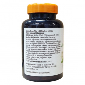 A Caleido GreenSlim készítmény zöld kávé kivonatot, zöld tea kivonatot, cayenne borsot, valamint riboflavint és krómot tartalmazó étrend-kiegészítő kapszula. Napi két kapszula bevitele javasolt, amely koffeint is tartalmaz. A termék nem ajánlott koffeinre érzékeny, terhes vagy szoptató nők, gyermekek és bizonyos egészségügyi problémákkal küzdők számára. A zöld tea az anyagcsere és a zsíranyagcsere támogatásában vehet részt, ugyanakkor az étrend-kiegészítő nem helyettesíti a kiegyensúlyozott táplálkozást és egészséges életmódot. A termék kapszulák formájában, 60 darabos kiszerelésben érhető el. Tárolása száraz, hűvös és fényvédett környezetben, gyermekektől elzárva ajánlott. A termék Spanyolországban készül.