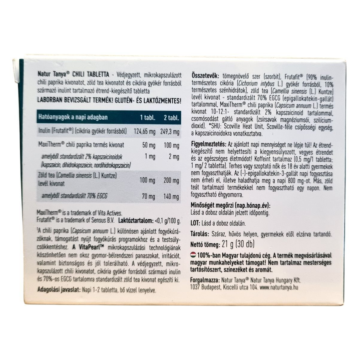 A Natur Tanya® CHILI TABLETTA egy magyar márkájú étrend-kiegészítő, amely mikrokapszulázott chili paprika kivonatot, zöld tea kivonatot és cikória gyökérből származó inulint tartalmaz. A termék laborban bevizsgált, glutén- és laktózmentes, valamint vegán étrendbe illeszthető. A chili paprika kivonat különösen ajánlott lehet fogyókúrázóknak, mivel támogathatja a testsúlycsökkentést. A VitaPearl™ mikrokapszulázási technológiának köszönhetően a termék nem okozhat gyomor-bélrendszeri panaszokat, irritációt, és biztonságos, jól tolerálható lehet. A termék nem tartalmaz mesterséges tartósítószert, színezéket és aromát, és a megvásárlásával magyar munkahelyeket támogathat.