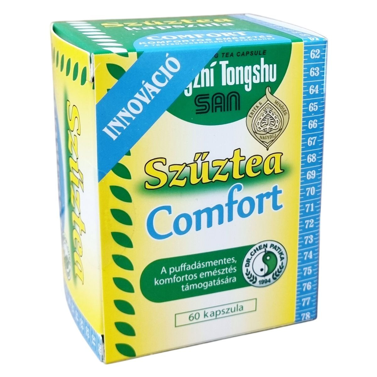 A Szűztea Comfort a hagyományos Szűztea új generációs fejlesztése, amely kifejezetten az emésztés normál gáz-egyensúlyának fenntartását célozza. Összetevői között megtalálható a zöldtea polifenol, mely hozzájárulhat az anyagcsere támogatásához és a zsírok oxidációjához, valamint az olyan gyógynövények, mint az édeskömény és az ánizs, amelyek az emésztőrendszer egészségét támogathatják. A koriander segíthet fenntartani a normál gáz-egyensúlyt, ezáltal támogatva a puffadás megelőzését, míg a szennalevél hozzájárulhat a bélműködés rendszerességéhez és az emésztés ritmusának fenntartásához. A termék nem helyettesíti a kiegyensúlyozott étrendet és az egészséges életmódot.