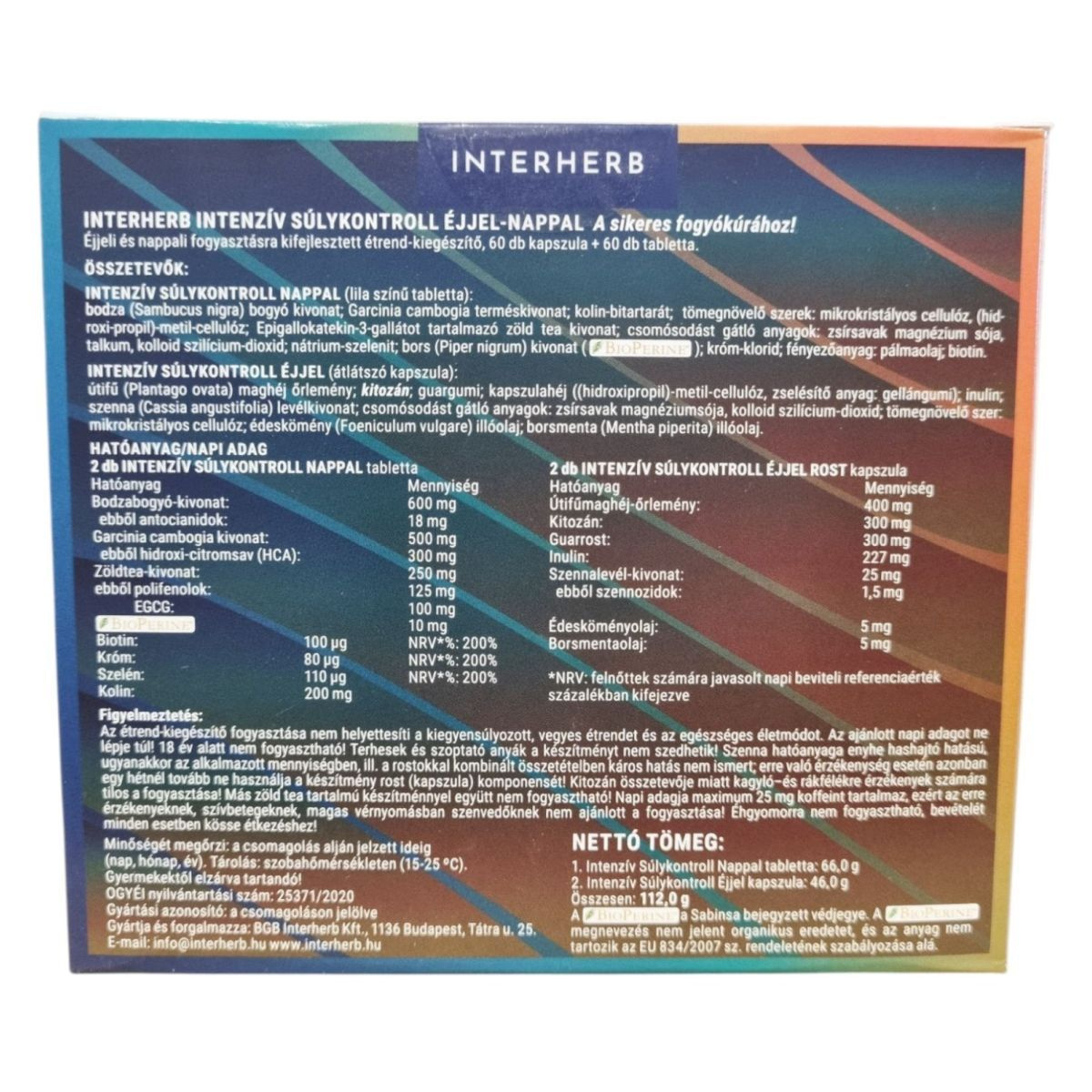 Az Interherb Intenzív Súlykontroll Éjjel-Nappal kétfázisú, komplex fogyókúrás készítmény, amely nappali tabletták és éjjeli rost kapszulák kombinációját kínálja. Napközben a bodza, zöld tea, Garcinia cambogia, kolin és króm hozzájárulhat a normál anyagcseréhez, vércukorszinthez és veseműködéshez. Az esti rost formula útifűmaghéjjal, kitozánnal, inulinnal és szennával támogathatja az emésztési komfortot, a rendszeres bélműködést és a testsúlycsökkentő diétát. A BioPerine (feketebors-kivonat) segítheti az egyes tápanyagok felszívódását. A kapszulák és tabletták alkalmazása egyszerű, a napi ajánlott mennyiség betartása mellett a megfelelő folyadékbevitel különösen fontos.