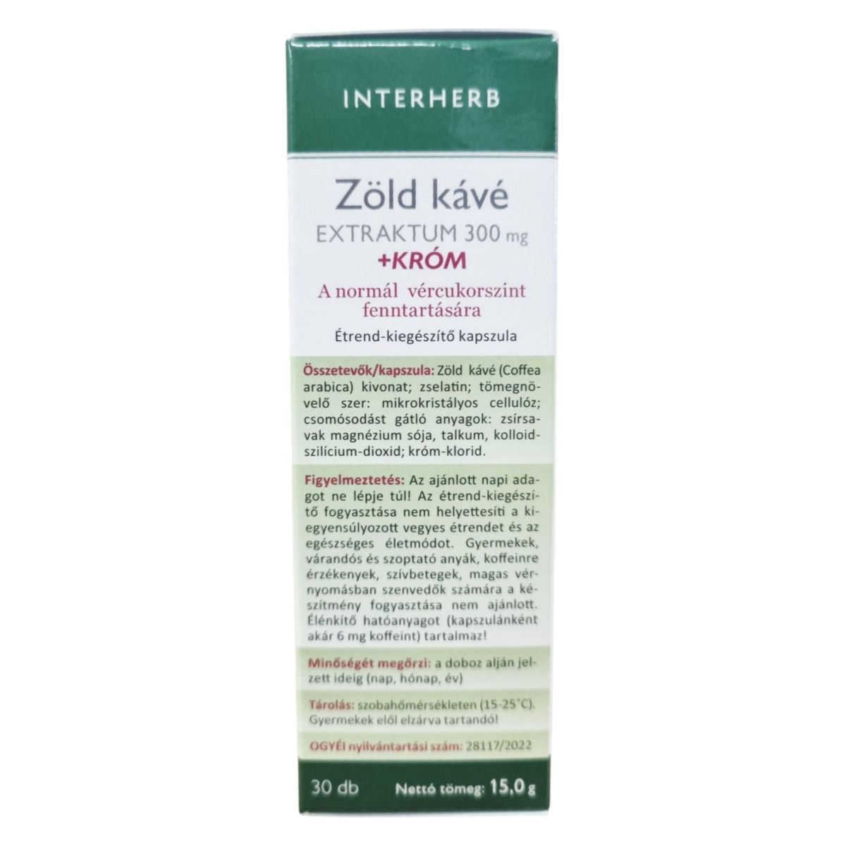 A zöld kávé kivonat a frissen szüretelt kávétermés valamennyi beltartalmi értékét hordozhatja, klorogénsav hatóanyagban gazdag, emellett mérsékelt koffein tartalom jellemzi. A króm hozzájárulhat a normál vércukorszint fenntartásához. A termék koncentrált extraktumot tartalmaz, bevizsgált alapanyagokból, hazai fejlesztés keretében készült. A normál vércukorszint fenntartásához szénhidrát diéta is szükséges lehet, ezért étkezéseinek összeállításakor tartsa szem előtt a csökkentett cukor tartalmú változatos, vegyes étrendet!