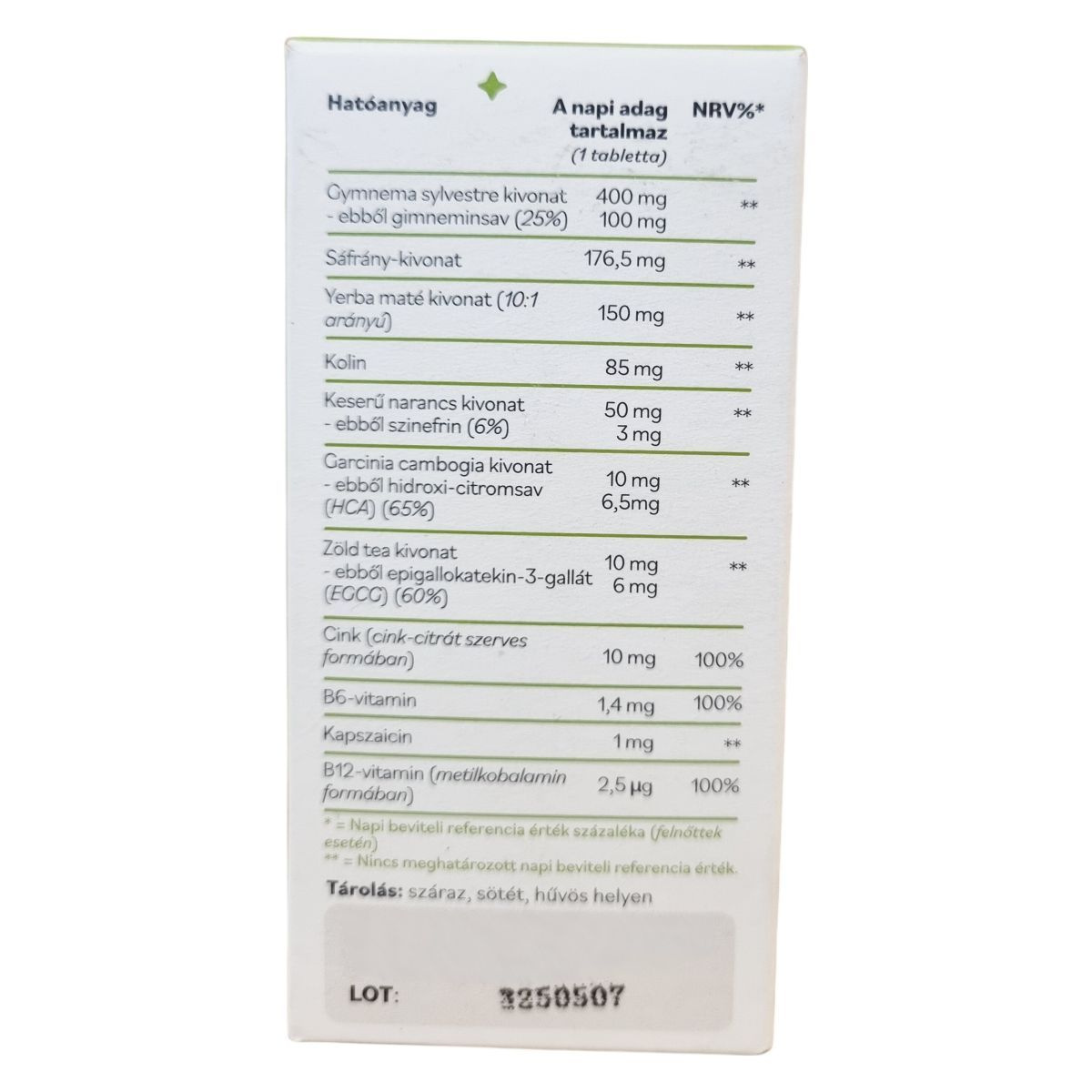 Gymnema sylvestre levél kivonat, tömegnövelő szer (mikrokristályos cellulóz), DL-kolin-bitartarát, sáfrányvirág kivonat (Crocus sativus), yerba maté levél kivonat (Ilex paraguariensis), bevonat (sűrítőanyag: hidroxi-propil-metil-cellulóz, színezék: vas-oxidok, stabilizátor: polietilénglikol, csomósodást gátló anyagok: zsírsavak magnéziumsói), keserű narancs gyümölcs kivonat (Citrus aurantium), térfogatnövelő szer (térhálós cellulózgumi), cink-citrát, csomósodást gátló anyagok (zsírsavak magnéziumsói, szilícium-dioxid), paprika gyümölcs kivonat (Capsicum annuum), zöld tea levél kivonat (Camellia sinensis), Garcinia cambogia gyümölcs kivonat, B6-vitamin (piridoxin-hidroklorid), B12-vitamin (metilkobalamin)